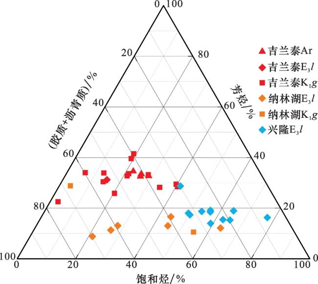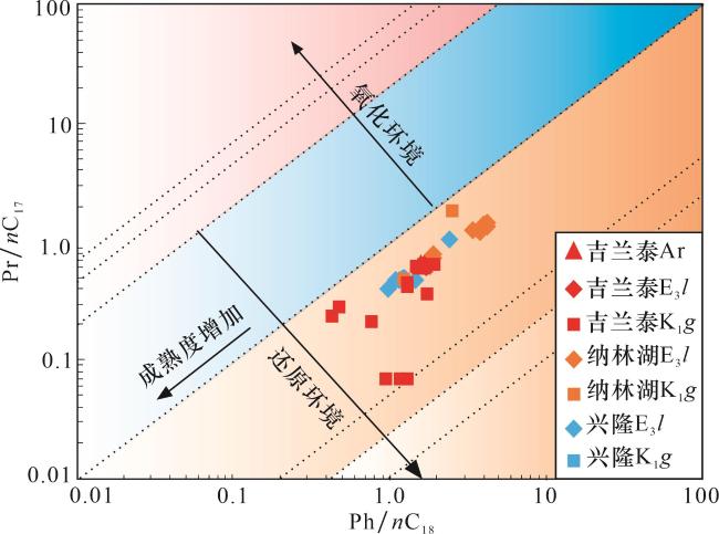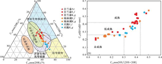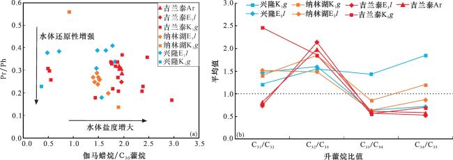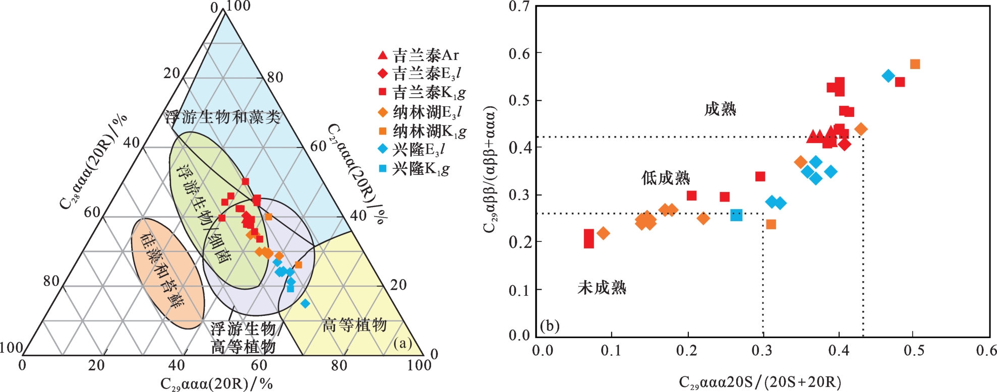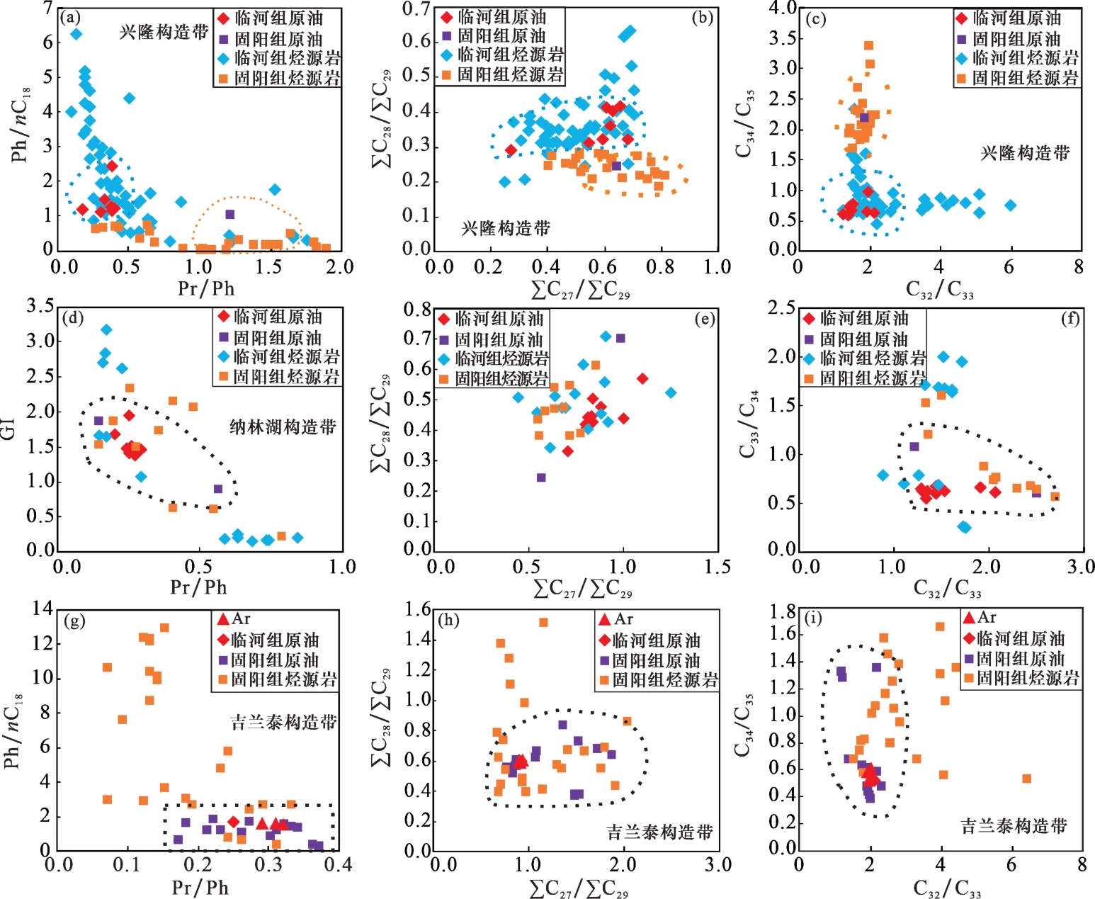 表4 河套盆地临河坳陷原油和烃源岩饱和烃生物标志化合物参数统计Table 4 Statistical table of saturated hydrocarbon biomarker parameters of crude oil and source rock in Linhe Depression, Hetao Basin |