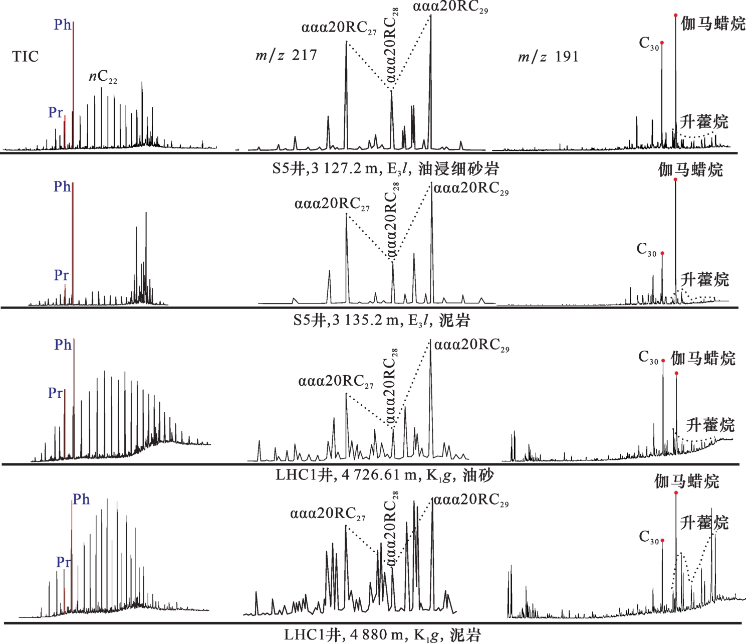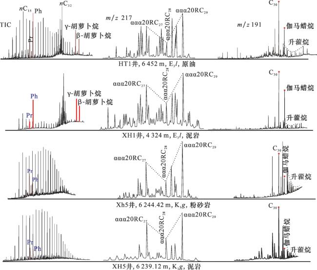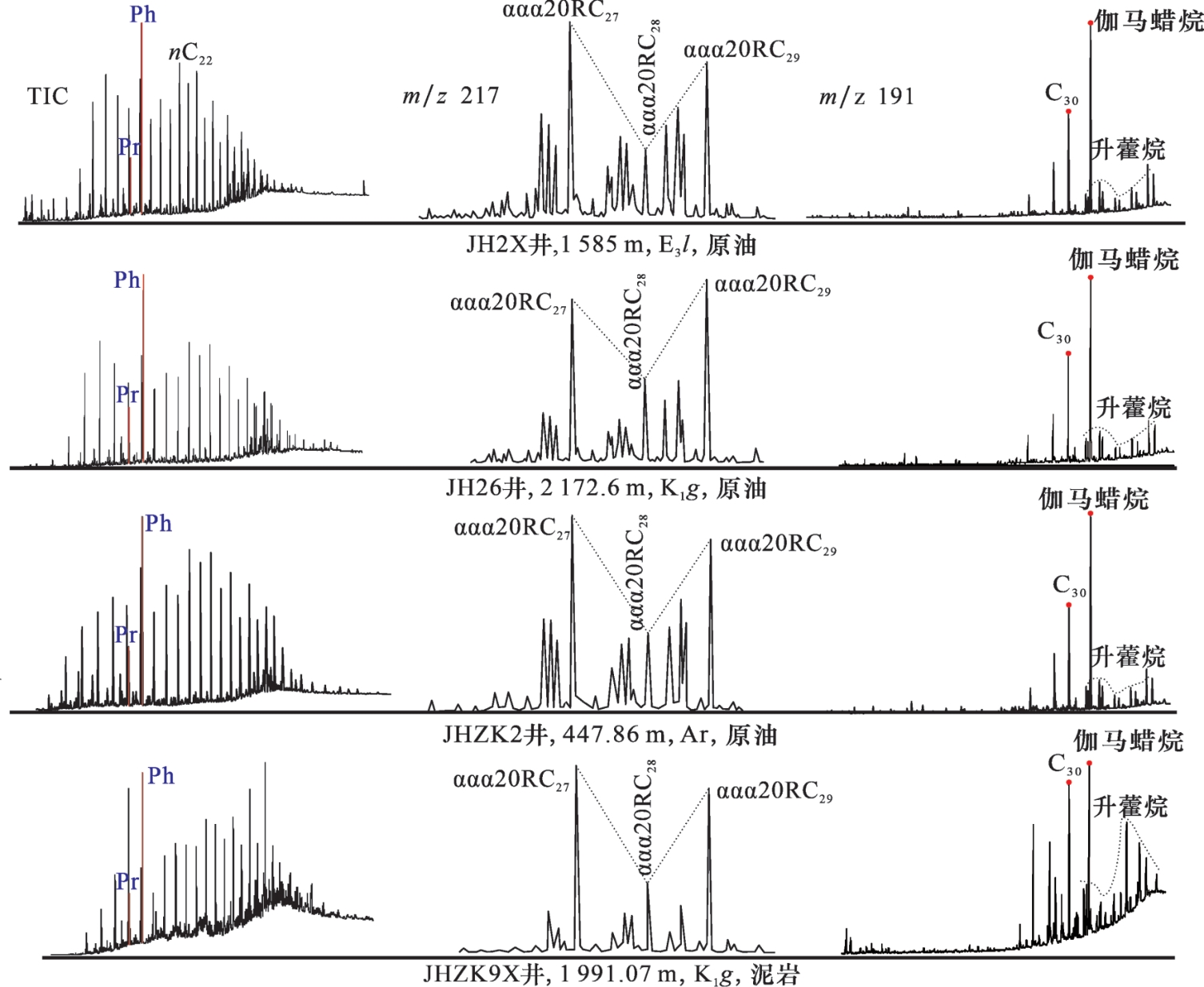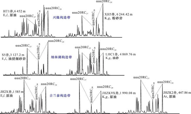 图6 河套盆地临河坳陷不同构造带原油典型饱和烃m/z 217质量色谱Fig.6 m/z 217 mass chromatograms of typical saturated hydrocarbons in different structural zones of Linhe Depression in Hetao Basin |