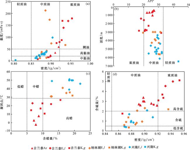 图2 河套盆地临河坳陷不同构造带原油物性参数交会图Fig.2 Intersection diagram of crude oil physical property parameters in different structural zones of Linhe Depression, Hetao Basin |
