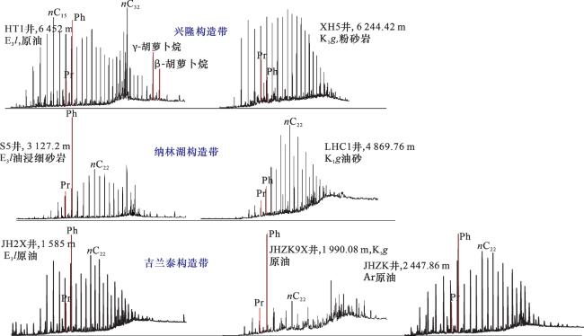 表2 河套盆地临河坳陷不同构造带原油和油砂饱和烃气相色谱参数Table 2 Gas chromatographic parameters of saturated hydrocarbon of crude oil and oil sand in different structural belts of Linhe Depression in Hetao Basin |