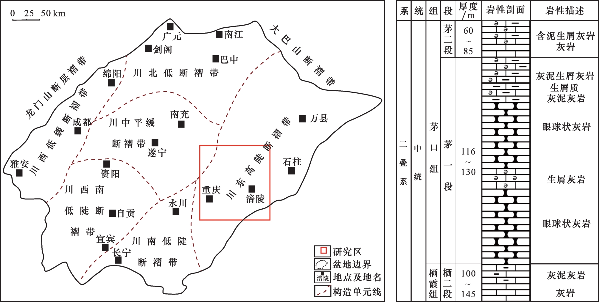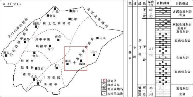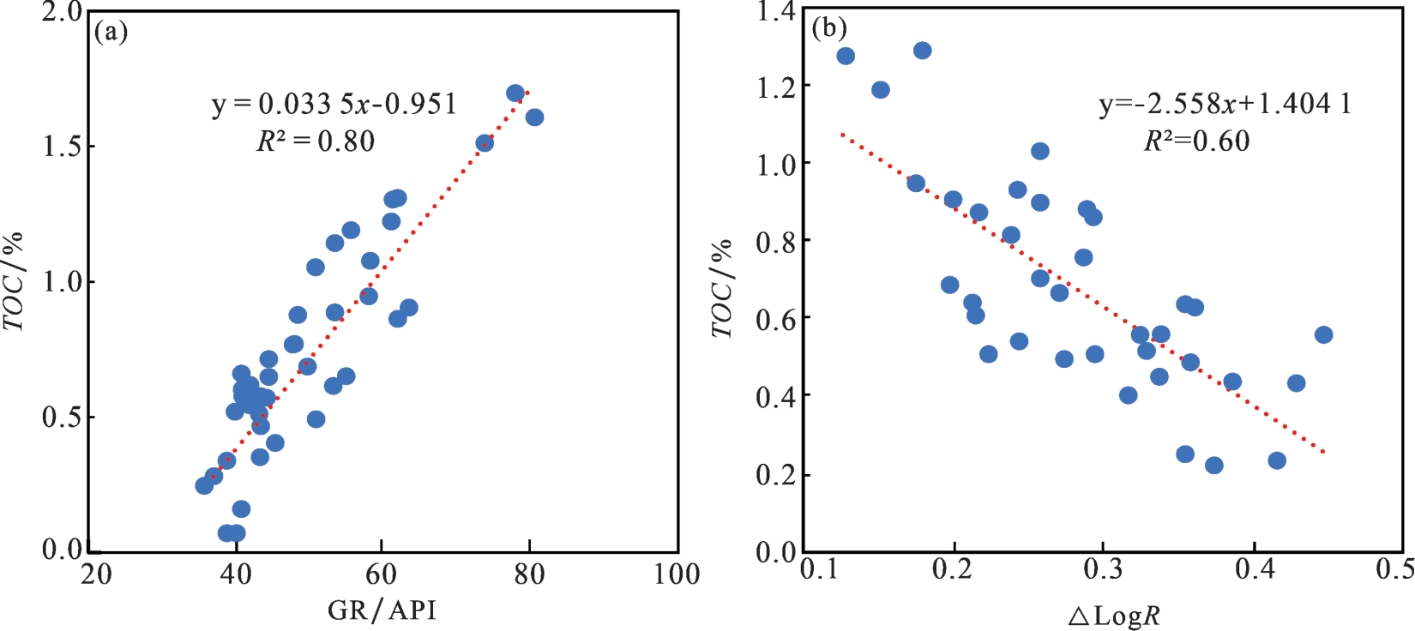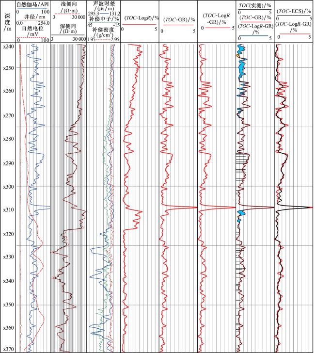 TOC计算模型,但该方法具有区域局限性。茅口组一段地层碳酸盐矿物含量高,并且发育薄层泥质条带与眼球眼皮构造,因此上述常规测井经验模型均难以用于准确计算