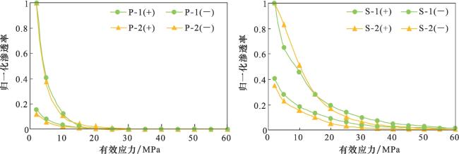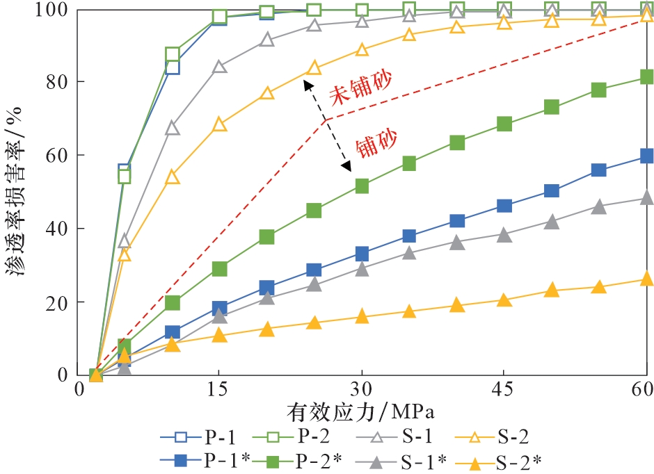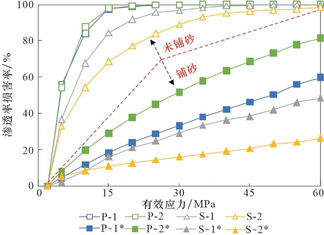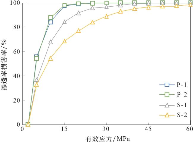 样品编号 | 初始渗透率 /(10-3 µm2) | 残余渗透率 /(10-3 µm2) | 卸载后渗透率 /(10-3 µm2) | 最大渗透率 损害率/% | 不可逆渗透率 损害率/% |