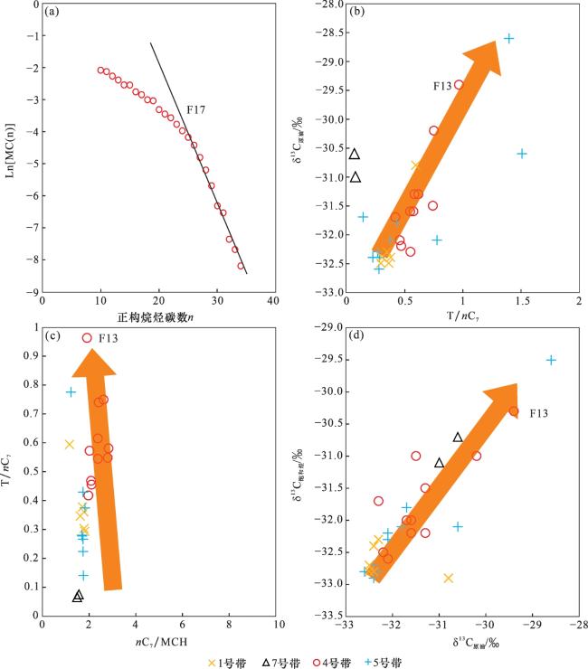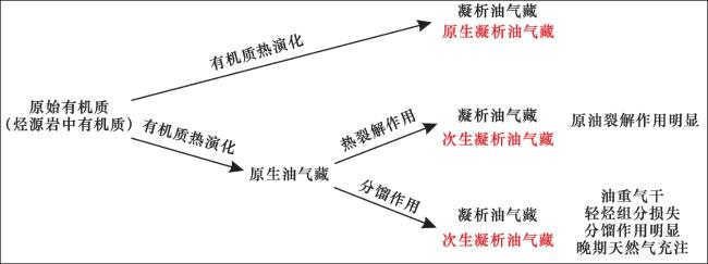 [2]按照成因将凝析油气分为4类:①I—II型有机质经排烃后形成;②未经排烃的II—III型有机质形成;③原油裂解形成;④次生改造形成。其中前2类凝析油气为原始有机质热演化形成,后2类为早期形成的油气藏经历一定的次生作用形成
