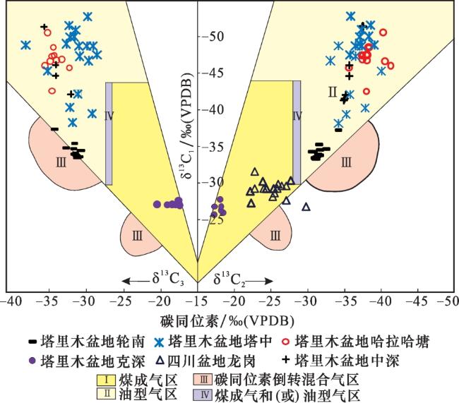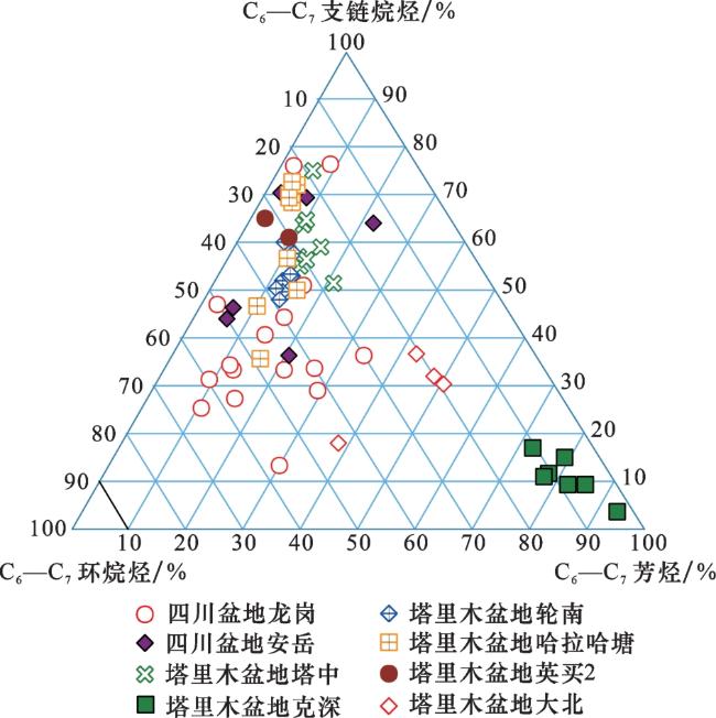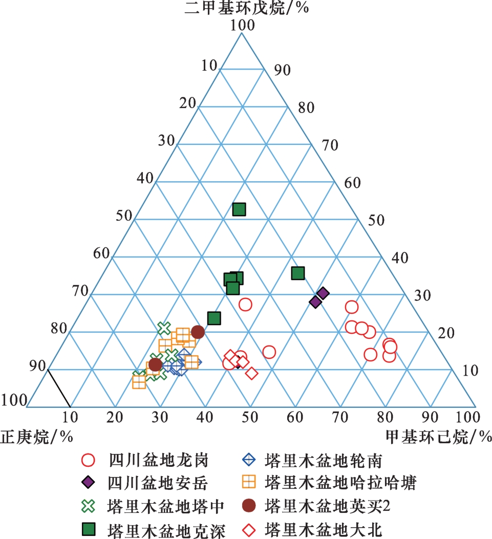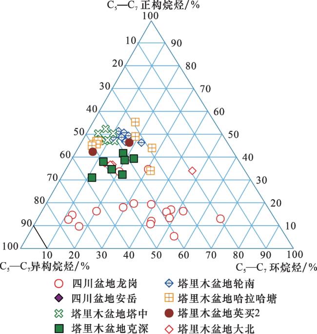 图3 中国深层—超深层天然气C5-7轻烃三角图Fig.3 Triangle diagram of C5-7 light hydrocarbons in deep to ultra deep natural gas in China |