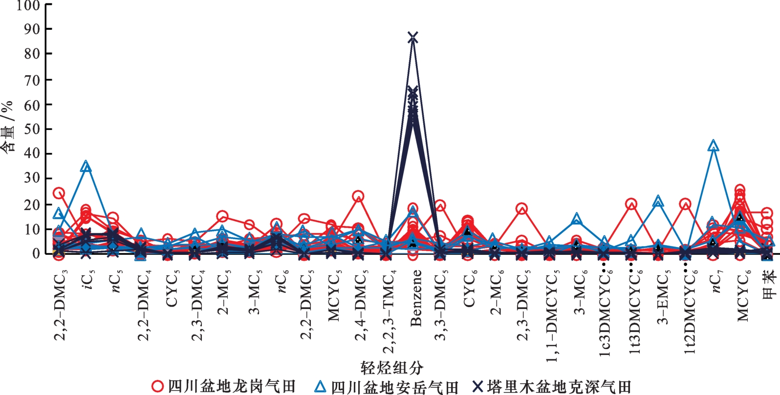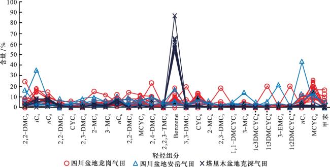 图2 中国深层—超深层天然气C6-7轻烃分布Fig.2 Distribution map of C6-7 light hydrocarbons in deep to ultra deep natural gas in China |