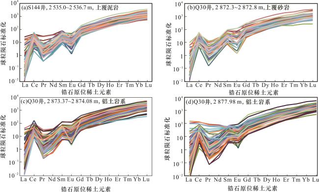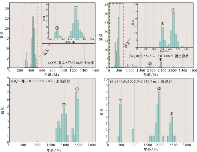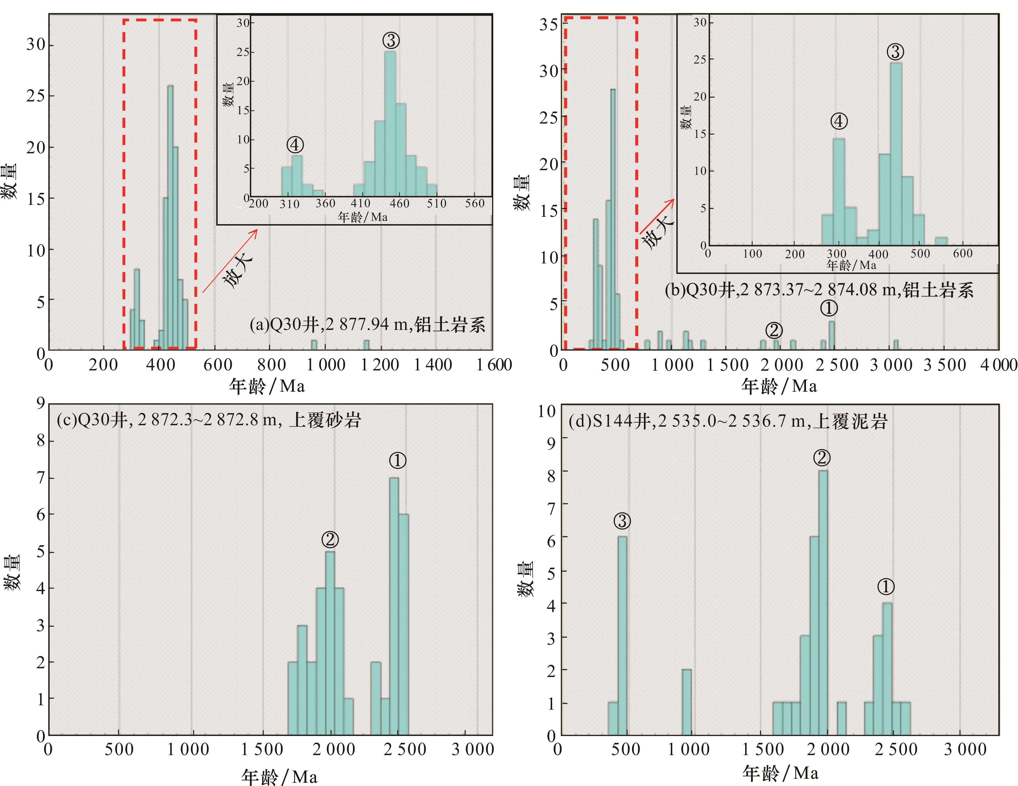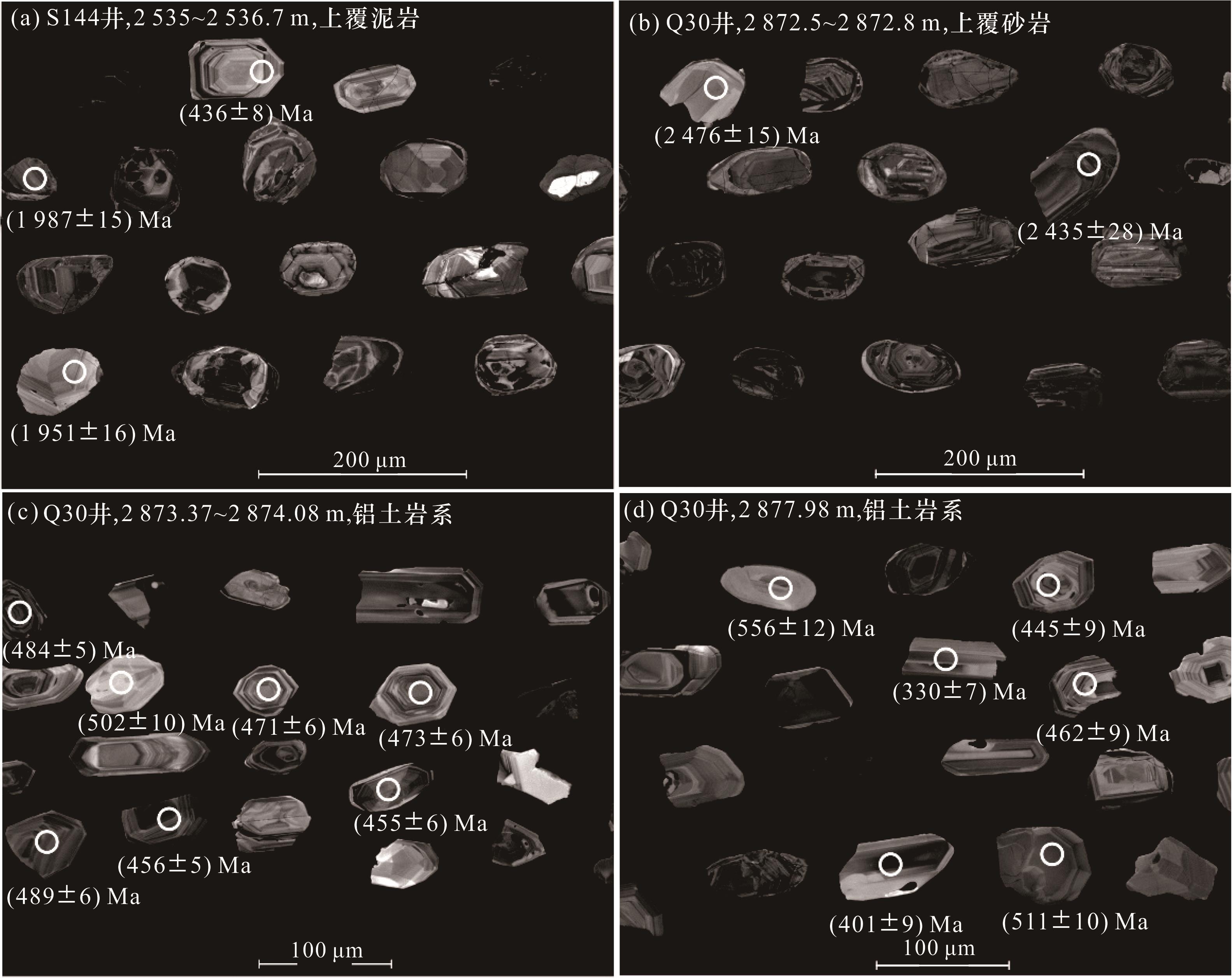 图3 鄂尔多斯盆地东部本溪组铝土岩系及其上覆砂泥岩中碎屑锆石的形态和U-Pb年龄(a)上覆泥岩;(b)上覆砂岩;(c),(d)铝土岩系 Fig.3 Morphology and U-Pb ages of detrital zircons in the bauxite rock series and its overlying sandstones/mudstones in the Benxi Formation in the eastern Ordos Basin |