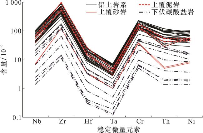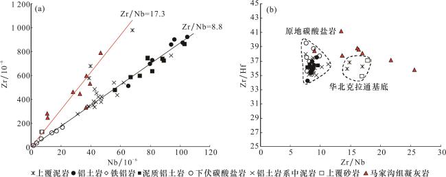 (3)研究区本溪组铝土岩系富集稳定元素,Zr、Nb丰度明显高于下伏碳酸盐岩和上覆砂岩。铝土岩系的Zr/Nb值与下伏碳酸盐岩的Zr/Nb值基本一致,但与上覆碎屑岩、马家沟组凝灰岩的Zr/Nb值明显不同。