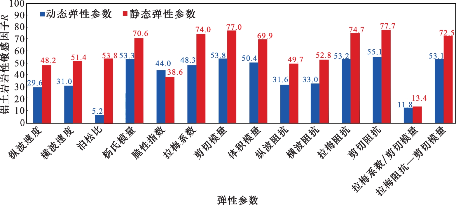 | 岩心 编号 | 岩性 | 一水铝石含量 /% | 黏土含量 /% | 静态纵波速度 /(m/s) | 静态横波速度 /(m/s) | 静态 泊松比 | 静态剪切阻抗 /107[(m/s)·(g/cm3)]2 | 静态脆性 指数 |