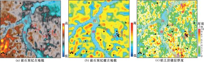 图10 庆城井区前石炭纪古地貌、微古地貌及铝土岩储层厚度分布Fig.10 Distribution of Pre-Carboniferous paleogeomorphology, micro aleogeomorphology, and bauxite reservoir thickness in Qingcheng well area |