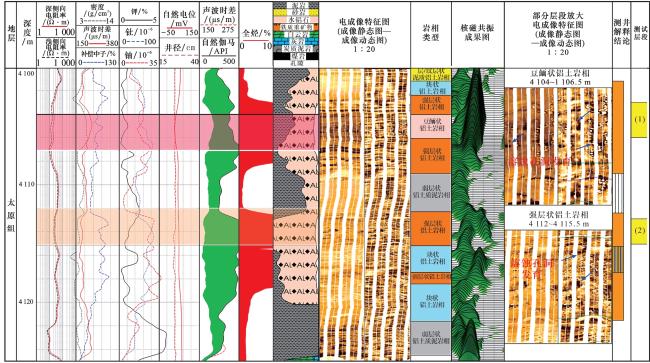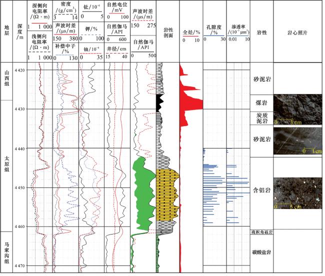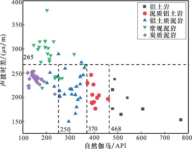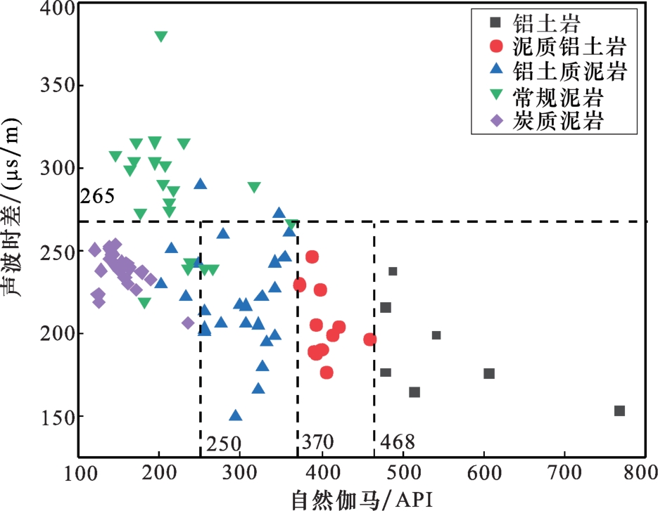 (2)含铝岩的测井响应与一般泥岩明显不同,主要表现为超高自然伽马、中低电阻率、高中子、高密度、中低声波时差的特点,其中超高自然伽马是由于沉积环境及铝土岩自身吸附大量铀、钍等高放射性元素引起;利用自然伽马与声波时差交会可对含铝岩层段进行直观快速识别。