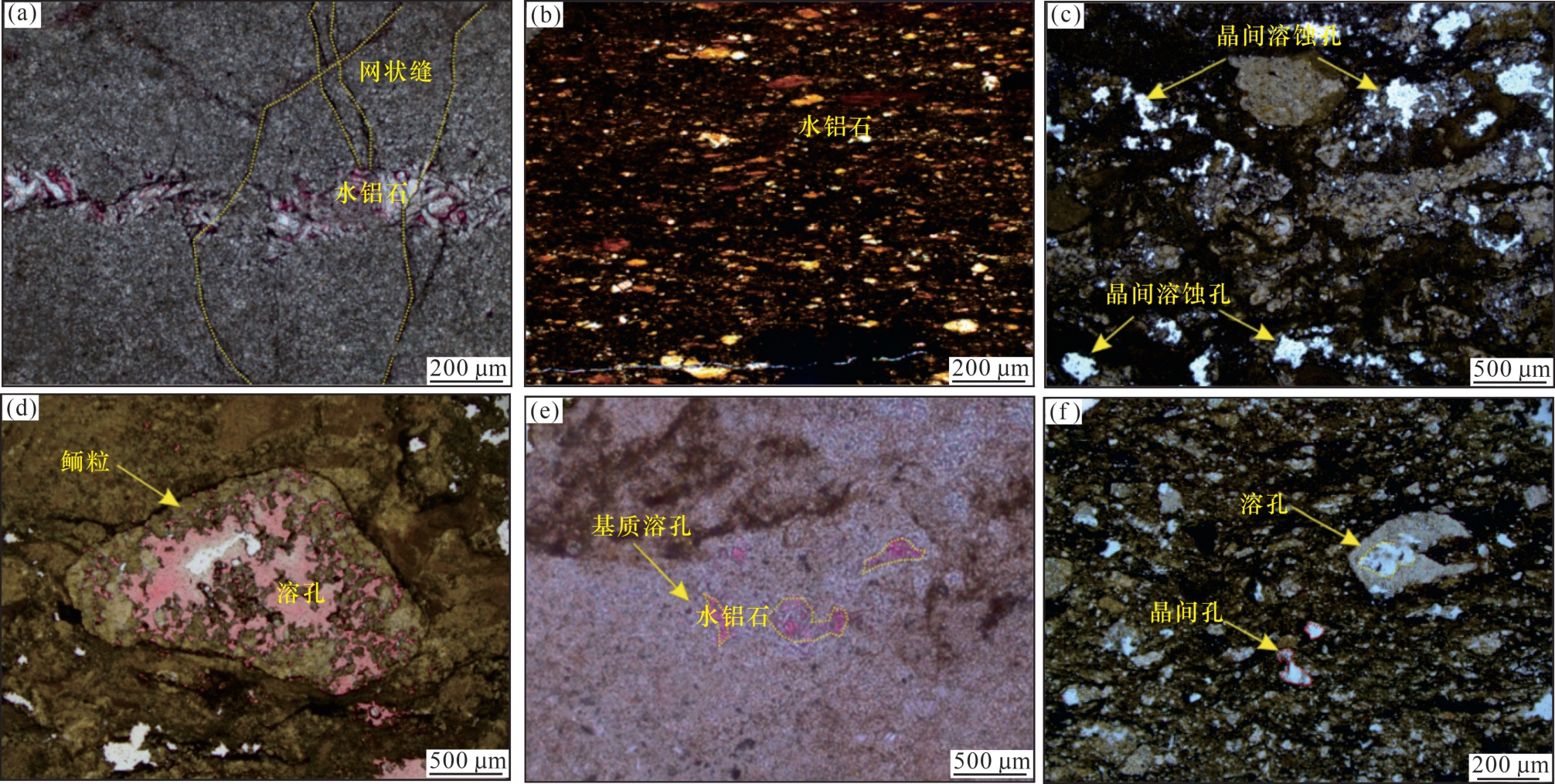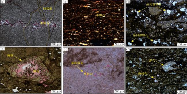 图8 鄂尔多斯盆地西南部陇东地区太原组含铝岩不同岩相类型典型薄片特征(a)层/弱层状泥质铝土岩相,网状缝,铝土质矿物半充填, HT2井,4 611.23 m; (b)块状铝土岩相,基本无可见孔隙,偶见颗粒间残余格架孔,L58井,4 044.48 m; (c)层状铝土岩相,晶间溶蚀孔发育(白色部分),L58井,4 048.30 m;(d)豆鲕状铝土岩相,鲕粒内溶孔发育,L58井, 4 049.0 m; (e)纹层状铝土质泥岩相, 少量基质溶孔, L47井, 4 107.0 m; (f)碎屑状铝土质泥岩相,偶见晶间孔, L58井, 4 051.10 m Fig.8 Typical lamellar characteristics of different lithofacies types of bauxites in the Taiyuan Formation in the Longdong area of Southwest Ordos Basin |