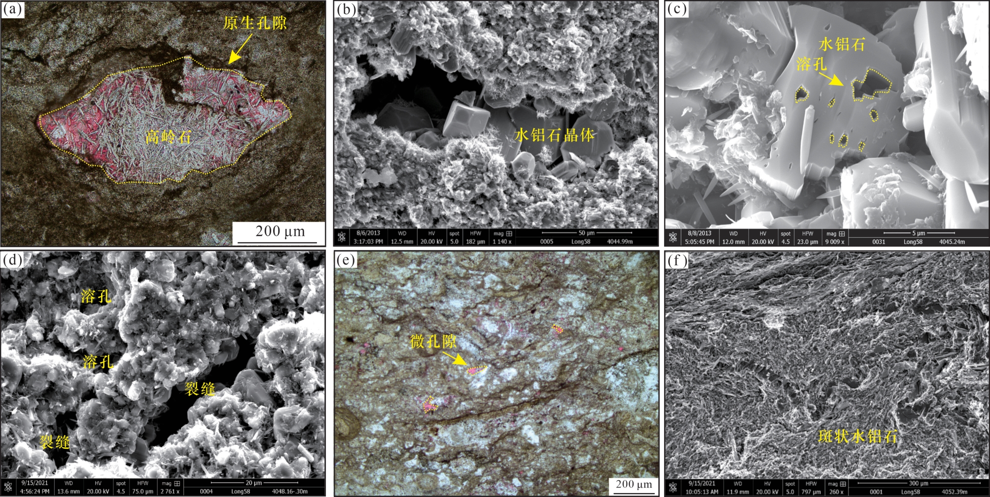 图9 鄂尔多斯盆地西南部陇东地区太原组含铝岩不同岩相扫描电镜特征(a)高岭石充填原生孔隙,L47井,4 107.0 m; (b)灰色铝土岩,溶蚀孔发育,见次生一水铝石单晶,L58井, 4 044.99 m; (c)铝土岩,水铝石粒内溶蚀微孔,L58井,4 045.24 m;(d)铝土岩,溶蚀孔隙及裂缝形态,L58井,4 048.16~4 048.3 m;(e)微孔隙,面孔率0.5%,C3-25-11井,3 807.54 m; (f)铝土质泥岩,水铝石斑状及裂缝充填状, L58井, 4 052.39 m Fig.9 Characteristics of different petrographic SEMs in bauxites in the Taiyuan Formation in the Longdong area of Southwest Ordos Basin |