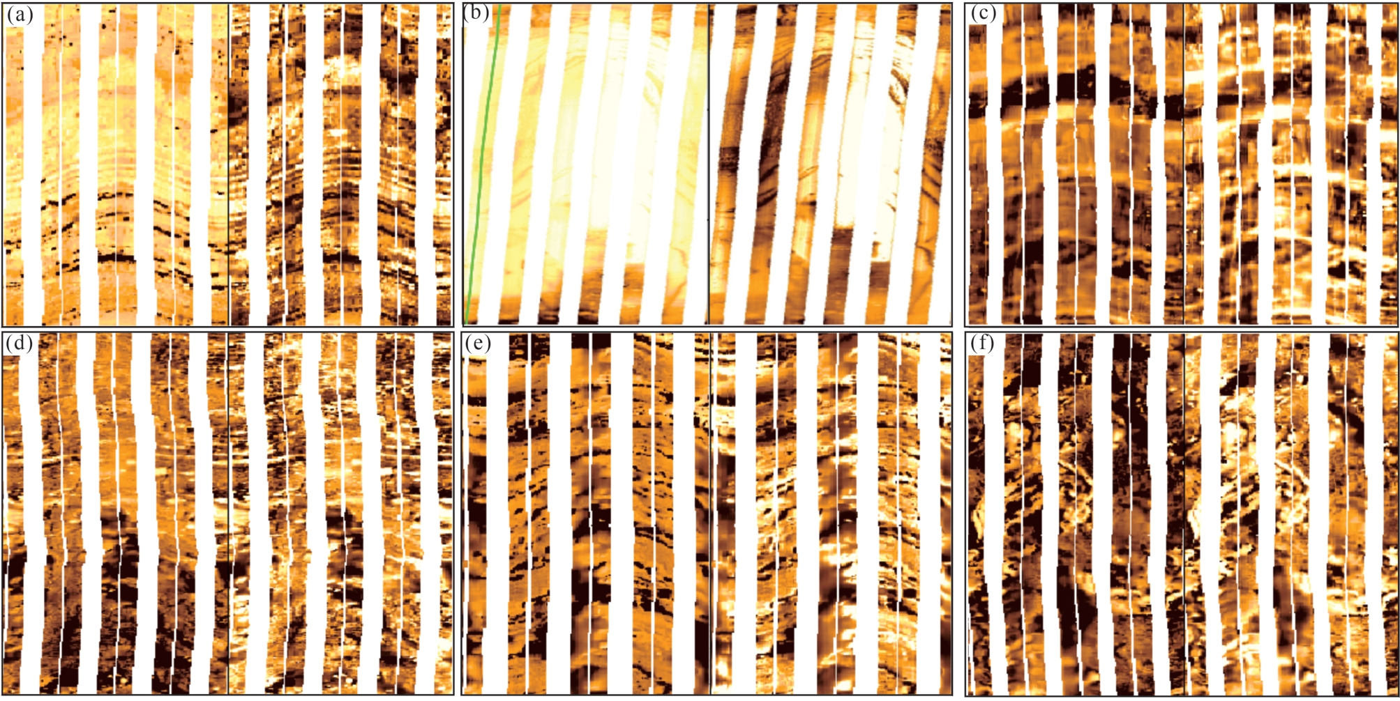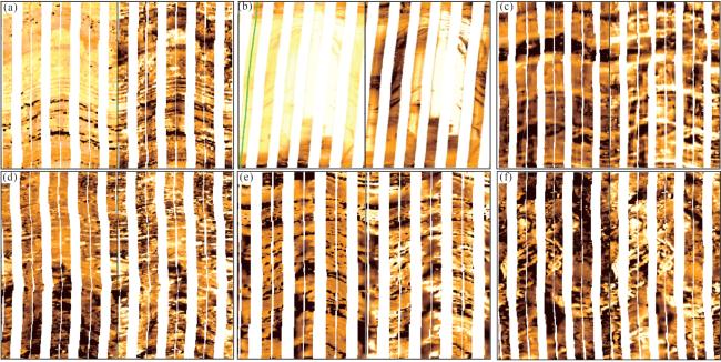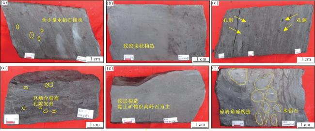 图7 鄂尔多斯盆地西南部陇东地区太原组含铝岩不同岩相类型典型岩心特征(a)层/纹层状泥质铝土岩相,50%<水铝石含量<75%,L58井,4 041.88 m; (b)块状铝土岩相,水铝石含量>75%,L58井,4 044.99 m; (c)层状铝土岩相, 水铝石含量>75%,L58井,4 048.3 m; (d)豆鲕状铝土岩相,水铝石含量>75%,L58井,4 050.0 m; (e)纹层状铝土质泥岩相, 水铝石含量<50%,L58井,4 039.60 m; (f)碎屑状铝土质泥岩相,水铝石含量<50%,L58井,4 052.40 m Fig.7 Typical core characteristics of different lithofacies types of bauxites in the Taiyuan Formation in Southwest Ordos Basin |