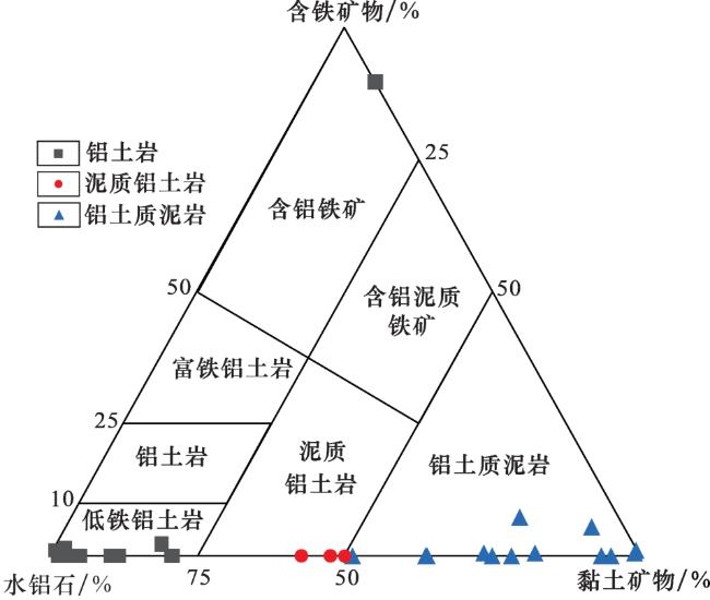 泥质铝土岩 | 层/弱层状泥质铝土岩相 | 层状、弱层状构造 | 层间缝、半充填裂缝 | 水铝石、黏土矿物参半 |