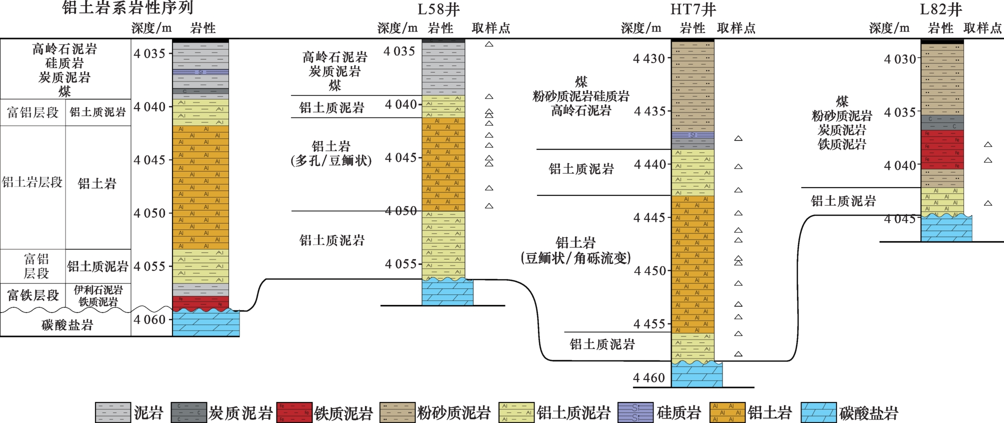 | L58 | 4 040.62 | 铝土质泥岩 | 40.03 | 35.93 | 0.58 | 1.85 | 2.27 | 0.08 | 0.04 | 0.05 | 0.67 | 0.05 | 0.00 | 2.49 | 15.67 | 97.93 |