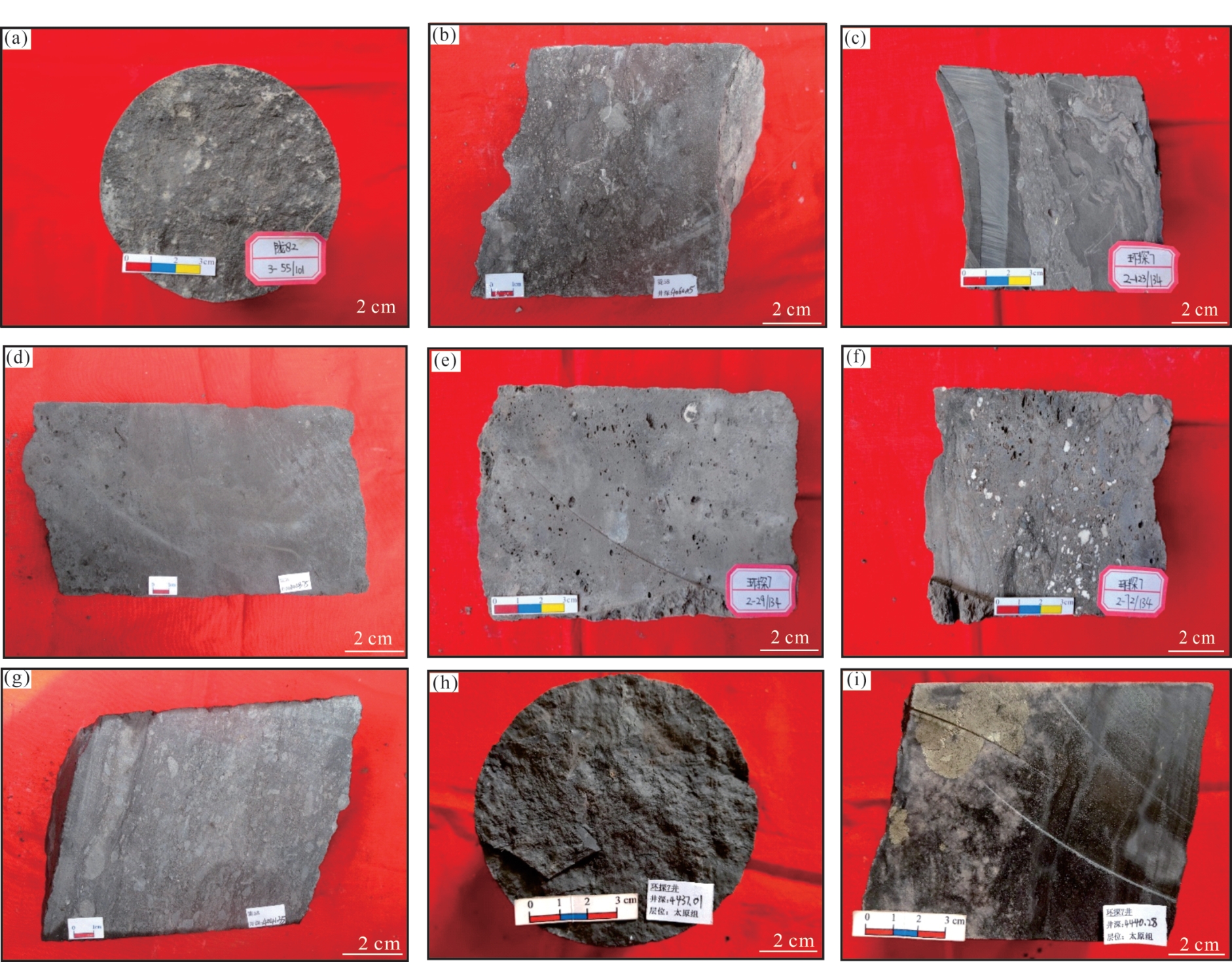 图3 陇东地区铝土岩系典型岩心照片(a)L82井,井深4 044.30 m,灰色菱铁矿泥岩;(b)L58井,井深4 060.05 m,块状伊利石泥岩;(c) HT7井,井深4 458.50 m,铝土质泥岩,流变结构;(d)L58井,井深4 048.75 m,土状、多孔状铝土岩;(e)HT7井,井深 4447.25 m,豆鲕状铝土岩,多孔;(f)HT7井,4 452.54 m,豆鲕状铝土岩,半充填;(g)L58井,井深4 041.35 m,豆鲕、碎屑状泥质铝土岩;(h)HT7井,井深4 437.01 m,硅质泥岩;(i)HT7井,井深4 440.28 m,高岭石泥岩,黄铁矿团块 Fig.3 Typical core photos of bauxite series in Longdong area |