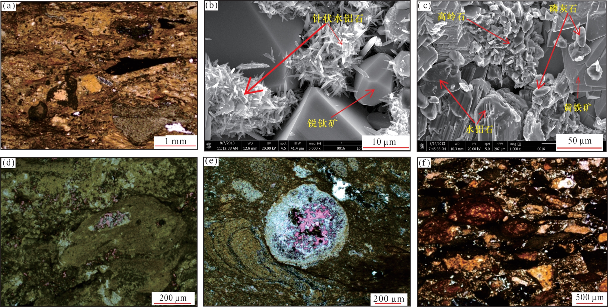 图4 陇东地区铝土岩系铸体薄片及扫描电镜照片(a) L58井, 4 041.00 m,铝土质泥岩,流变结构、碎屑状结构,碎屑为一水铝石(单偏光);(b) L58井,4 044.99 m,铝土岩,溶孔中锐钛矿、针状水铝石矿物充填(扫描电镜);(c) L58井,4 042.54 m,铝土岩中的矿物,自半形晶水铝石、黄铁矿、高岭石、磷灰石(扫描电镜);(d) L58井,4 044.99 m,铝土岩,凝胶状水铝石团块,并发生溶蚀(单偏光);(e)HT7井,4 449.26 m,豆鲕状铝土岩,豆鲕粒内溶孔,自生柱状一水铝石半充填(单偏光);(f) L58井,4 041.54 m,泥质铝土岩,具鲕粒结构,塑性颗粒拉长变形(单偏光) Fig.4 Thin section and SEM images of bauxite series in Longdong area |
