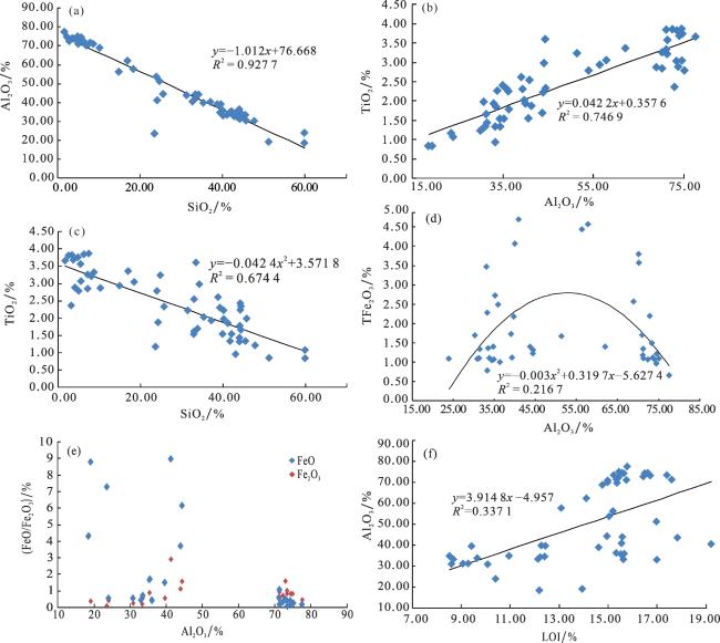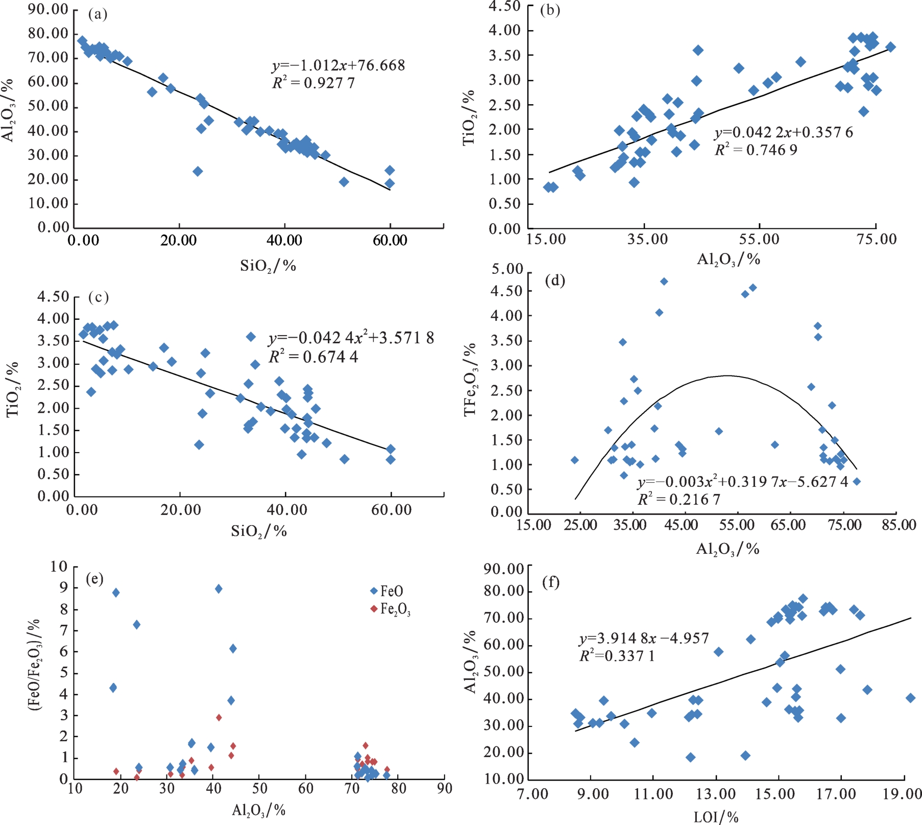 表1 鄂尔多斯盆地陇东地区铝土岩系典型井样品常量元素含量 (%)Table 1 Content of major elements in typical well samples of bauxite rock series in the Longdong area of the Ordos Basin |