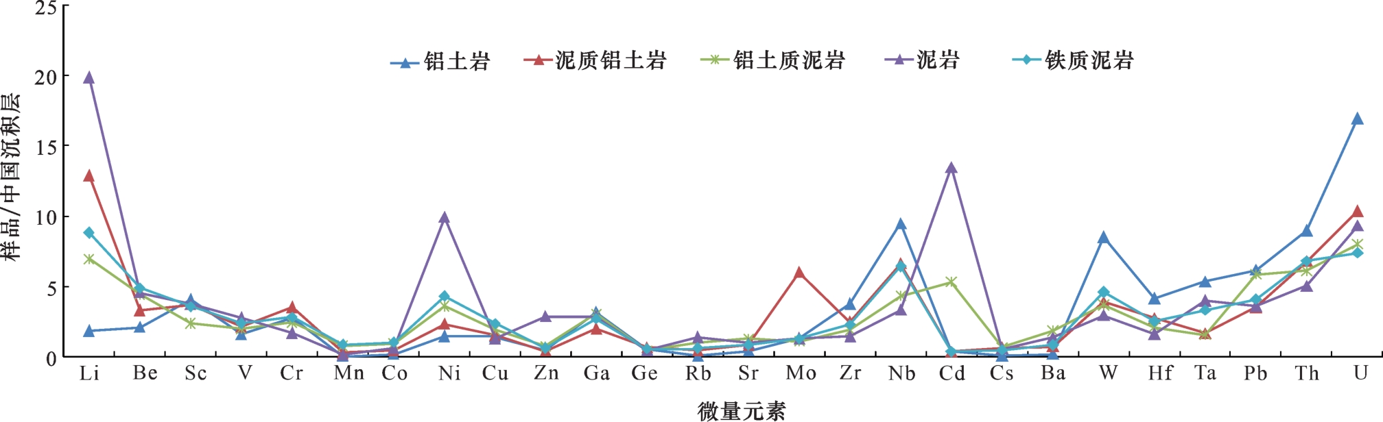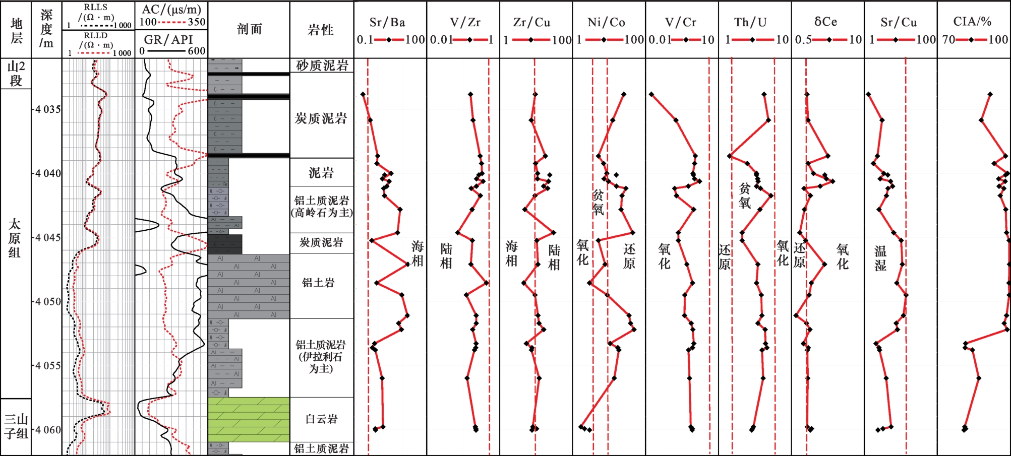 (2)研究区铝土岩系中的微量元素活动行为反映了湿热气候条件下,海侵海退周期频繁、氧化还原环境交替出现的成岩环境,Th/U值及Be元素揭示研究区铝土岩以风化—沉积成因为主,局部地段具残积成矿的特点。化学蚀变指数(CIA)反映了研究区铝土岩系高化学风化强度和温湿—热湿的气候环境,也反映出铝土岩赋在的中间部位风化程度高,而上部和下部泥岩风化程度相对较低。多项地球化学指标显示研究区铝土岩系主要以陆相淡水沉积环境为主,并有过渡相和海相沉积的特征。