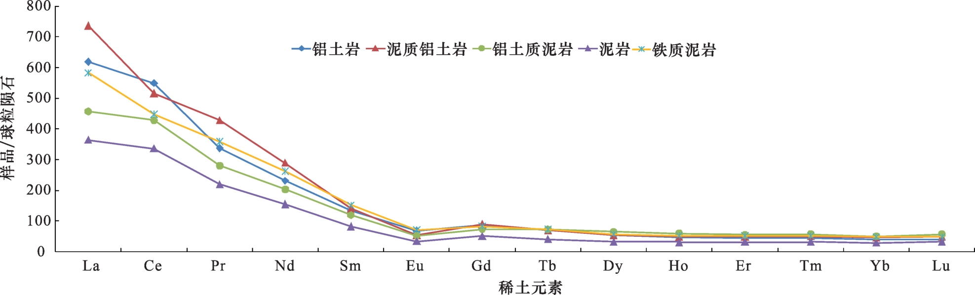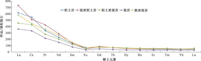 表3 鄂尔多斯盆地陇东地区铝土岩系典型井样品稀土元素含量 (10-6)Table 3 Rare earth element contents in typical well samples of bauxite rock series in the Longdong area of the Ordos Basin |