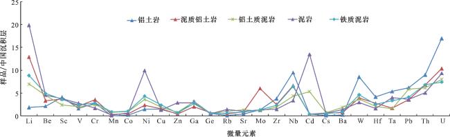 表2 鄂尔多斯盆地陇东地区铝土岩系典型井样品微量元素含量 (10-6)Table 2 Trace element contents in typical well samples of bauxite rock series in the Longdong area of the Ordos Basin |