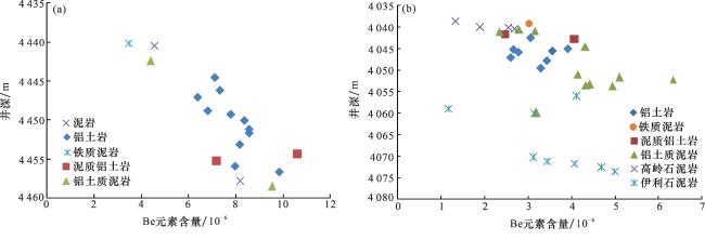 | 井号 | 井深/m | 岩性 | Li | Be | Sc | V | Cr | Mn | Co | Ni | Cu | Zn | Ga | Ge | Rb | Sr | Mo | Zr | Nb | Cd | Cs | Ba | W | Hf | Ta | Pb | Th | U | Sr/Ba | V/Zr | Ni/Co | V/Cr | Th/U | Sr/Cu | Zr/Cu |