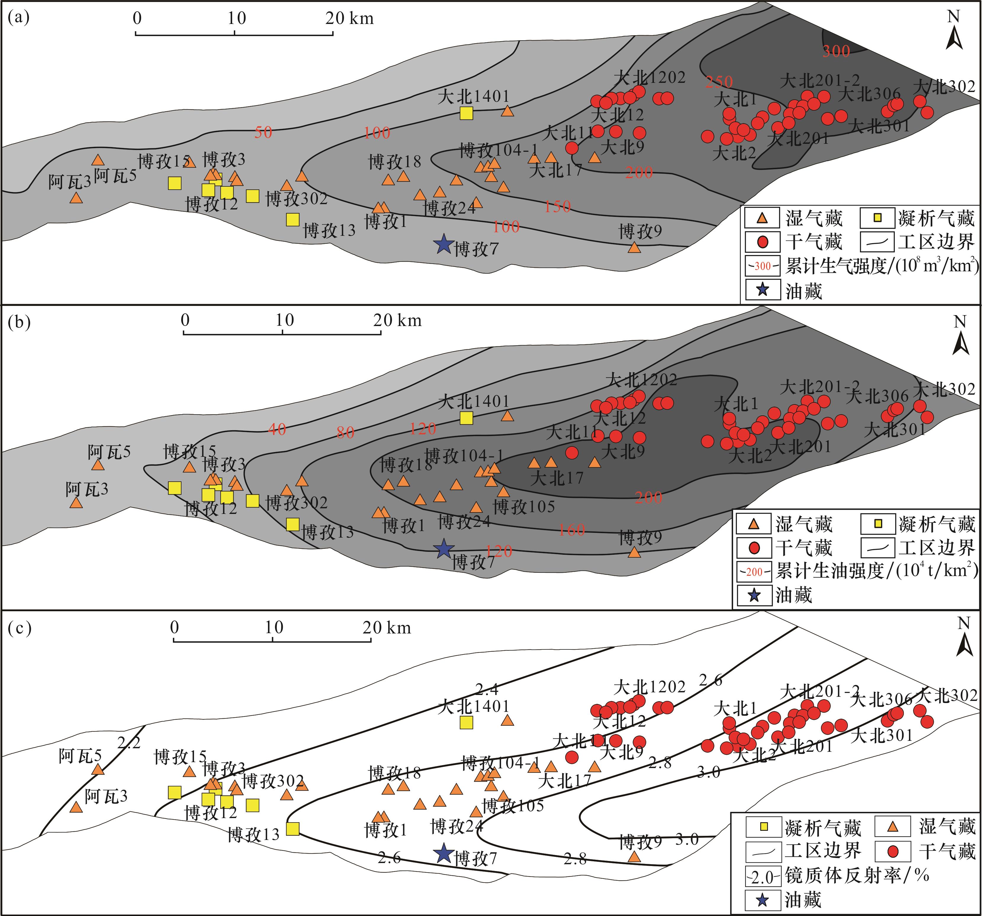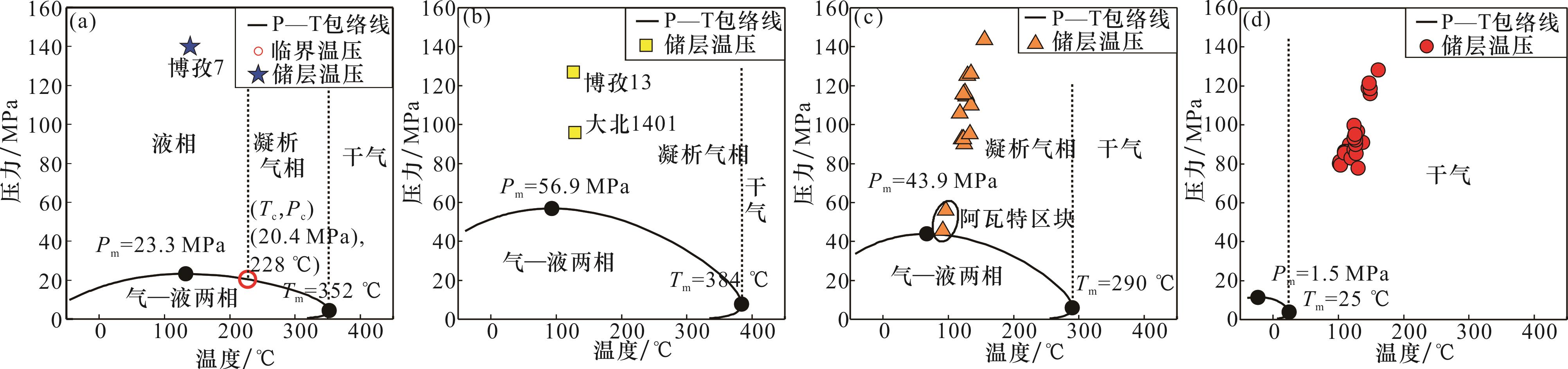 按照气油比和干燥系数为划分标准,将研究区内油气藏类型划分为4种类型:挥发性油藏、凝析气藏、湿气藏和干气藏,油气类型从东到西整体上呈环带状分布。相态模拟结果表明油气研究区油气相态纵向上由深到浅表现为挥发性油藏—凝析气藏—湿气藏—干气藏的油气分带特征,对应油气赋存状态从液相到凝析气相再到凝析气(湿气)相最后到气相。