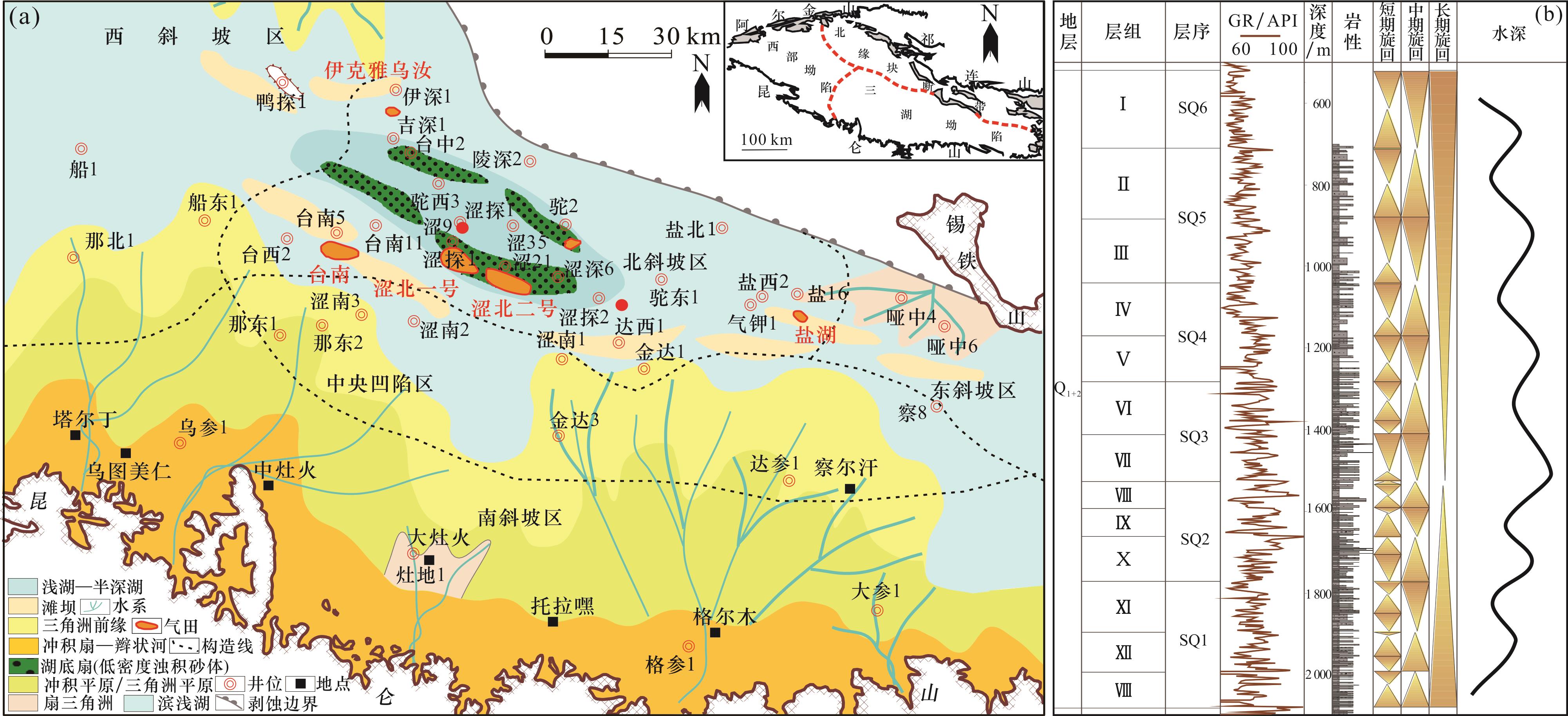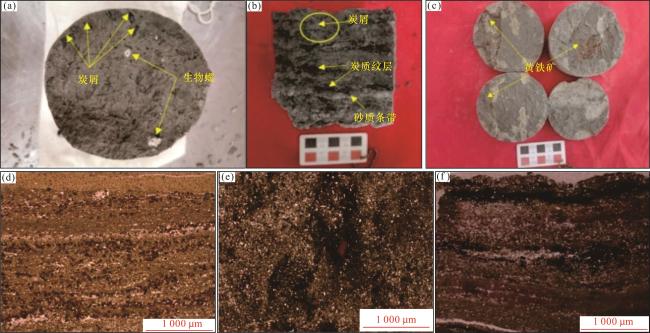 图2 第四系泥岩岩心特征(a)涩探1井,1 317.3 m,浅灰色含灰含粉砂泥岩,可见大量炭屑和生物螺碎片;(b)涩探2井,1 706.70 m,含粉砂泥岩,发育大量炭屑及炭质纹层,含砂质条带;(c)涩探2井,1 707.80 m,纹层状粉砂质泥岩,含黄铁矿;(d)涩探2井,条带状含泥晶球粒粉砂质泥岩,2×,(-);(e)涩探2井,粉砂质泥岩,2×,(-);(f)涩探1井,纹层含文石球粒状粉砂质泥岩,亮纹层厚2.85 mm,含黄铁矿纹层,厚0.27 mm,含黄铁矿微粒集合体,顺层分布,2×,(-) Fig.2 Characteristics of Quaternary mudstone cores |