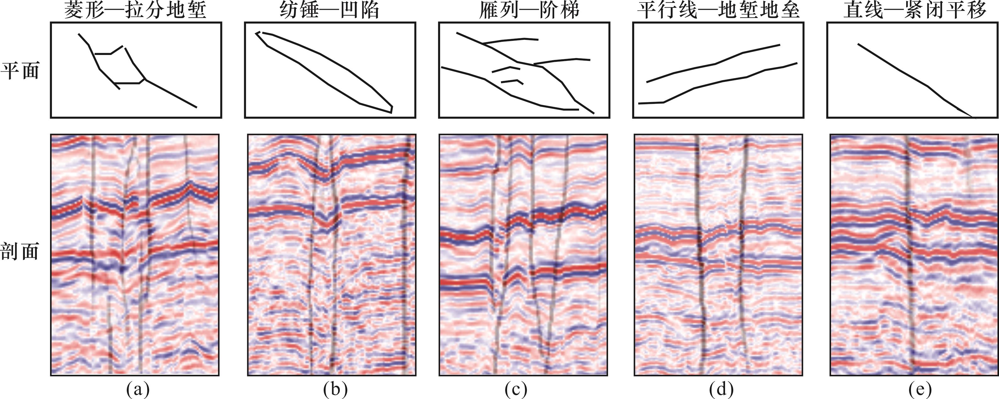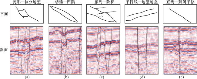 图10 长8段断缝体组合样式(a)菱形—拉分地堑式;(b)纺锤—凹陷式;(c)雁列—阶梯式;(d)平行线—地堑地垒式;(e)直线—紧闭平移式 Fig.10 Combination styles of Chang 8 Member fault-fracture bodies |
