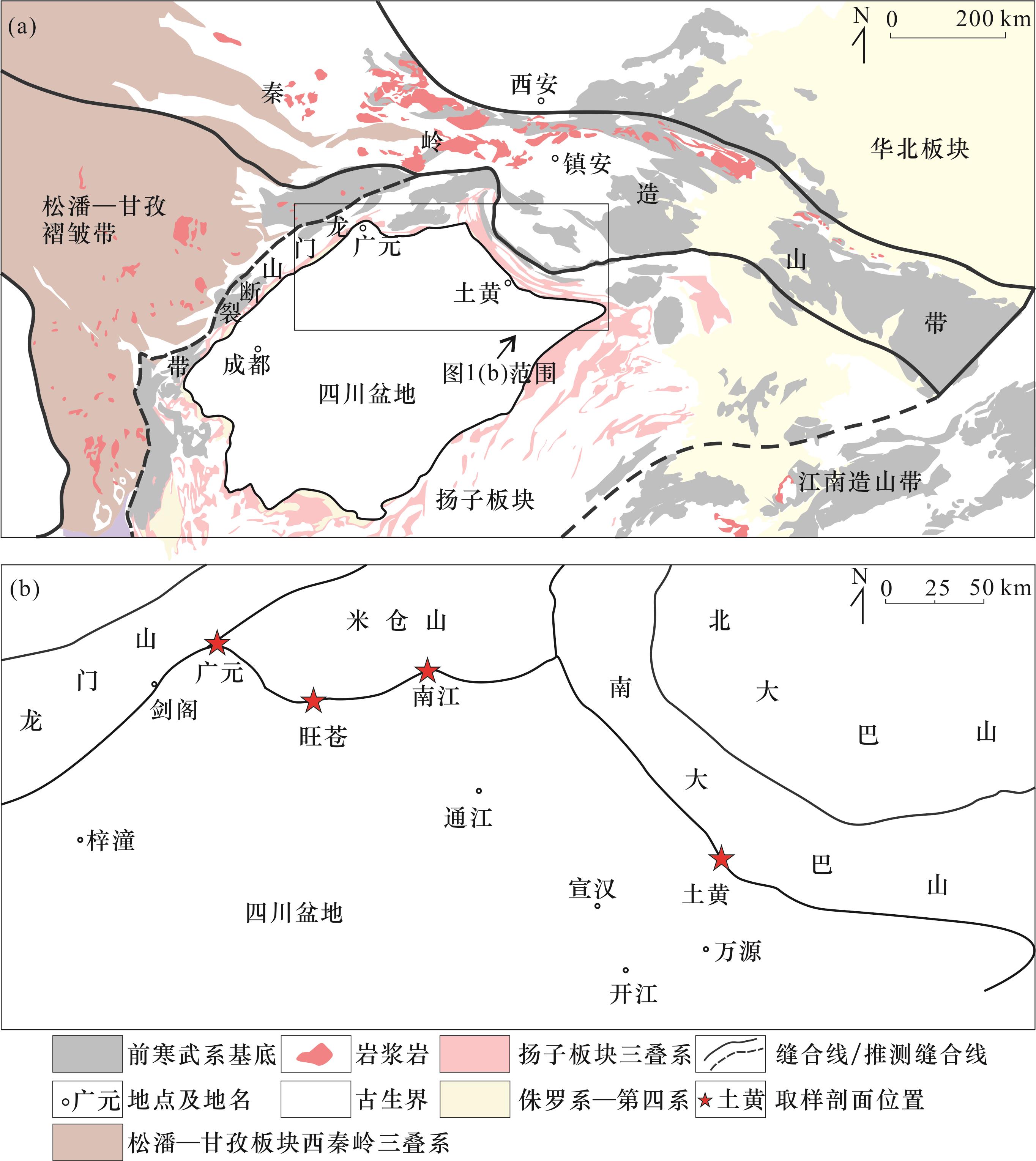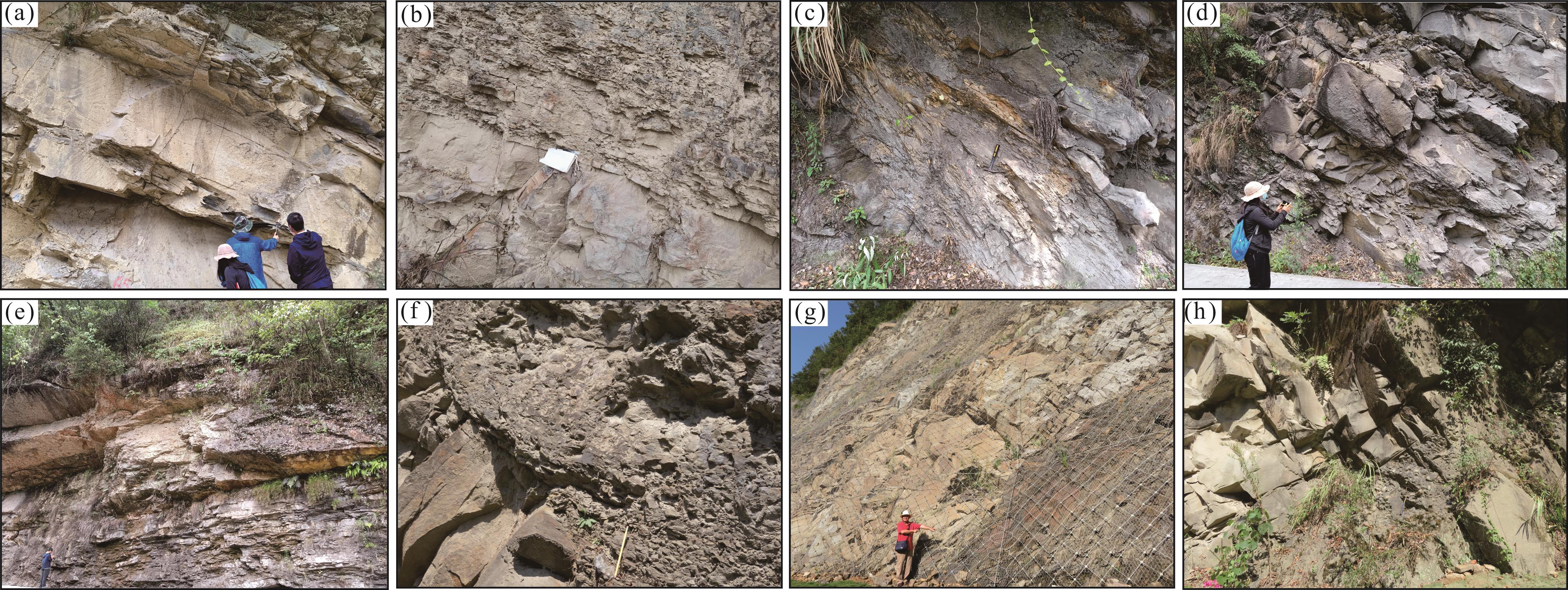 图2 四川盆地北部须家河组剖面的野外照片(a)广元剖面须家河组厚层砂岩;(b)广元须家河组底部石英砂岩与碎屑砂岩界面;(c)旺苍剖面须家河组下部泥岩粉砂岩互层;(d)旺苍剖面须家河组具楔状交错层理的透镜状砂岩;(e)南江剖面须家河组巨厚砾岩;(f)南江剖面须家河组厚层砂岩,顶部侵蚀面之上充填了撕裂屑砾石;(g)土黄剖面须家河组厚层块状砂岩与下伏雷口坡组白云岩的分界;(h)土黄剖面须家河组厚层砂岩与砾岩夹层 Fig.2 Outcrop photographs from the sections of the Xujiahe Formation located along the northern Sichuan Basin |