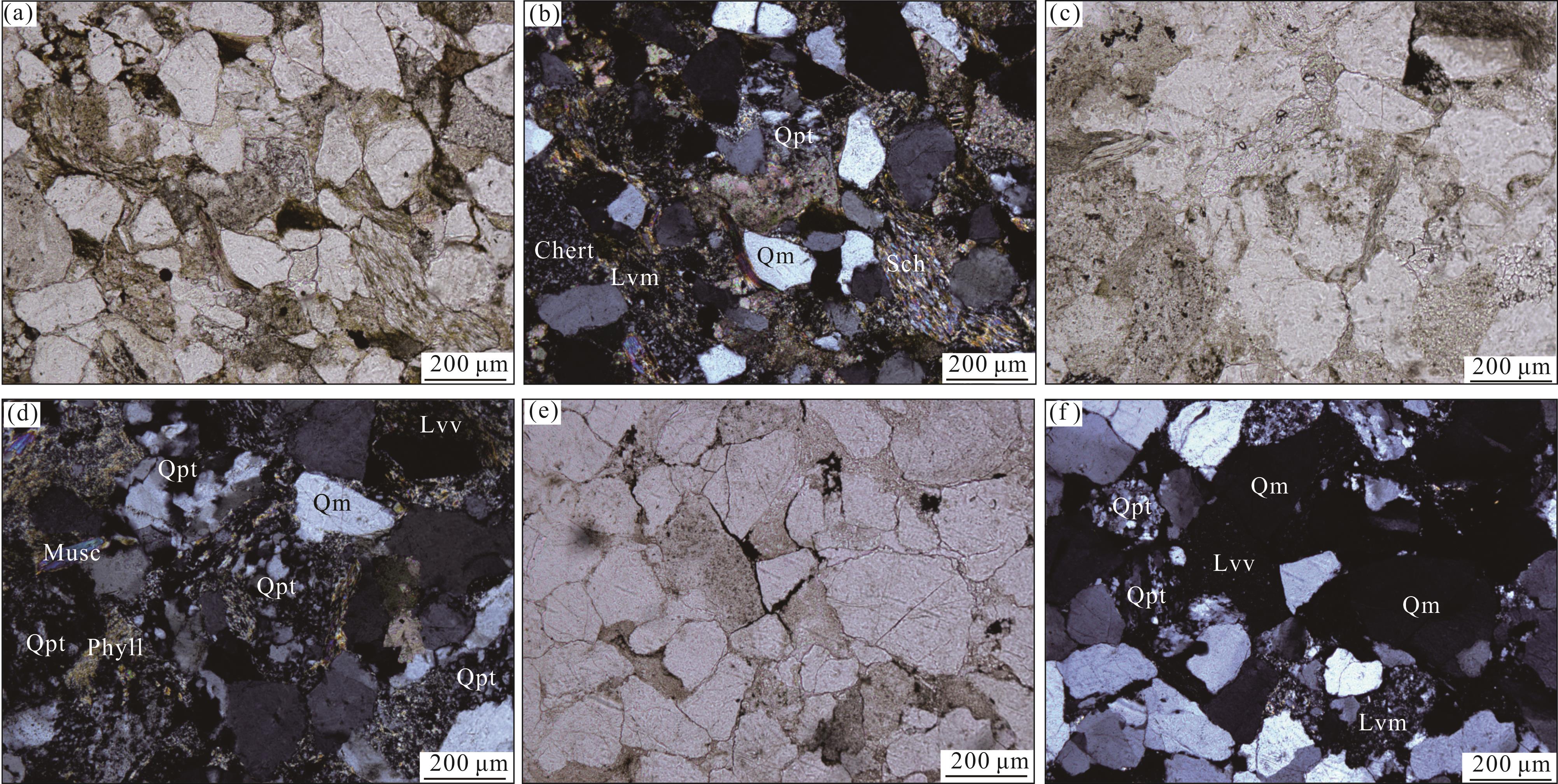 图3 须家河组砂岩偏光显微镜下薄片照片(a)、(b)为石英岩屑砂岩,岩屑为定向排列的多晶石英碎片、千枚岩和片岩、火山岩岩屑和燧石;(c)、(d)为岩屑石英砂岩,含定向排列的多晶石英碎片、千枚岩和火山岩,可见白云母;(e)、(f)为岩屑石英砂岩,主要为定向排列的多晶石英碎片以及火成岩岩屑。注:Qm:石英;Qpt:定向排列的多晶石英;Chert:燧石;Lvm:微晶火山岩;Lvv:隐晶质火山岩;Sch:片岩;Phyll:千枚岩;Musc:白云母 Fig.3 Photographs of sandstone thin-sections of the Xujiahe Formation under polarizing microscope |