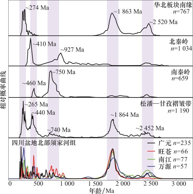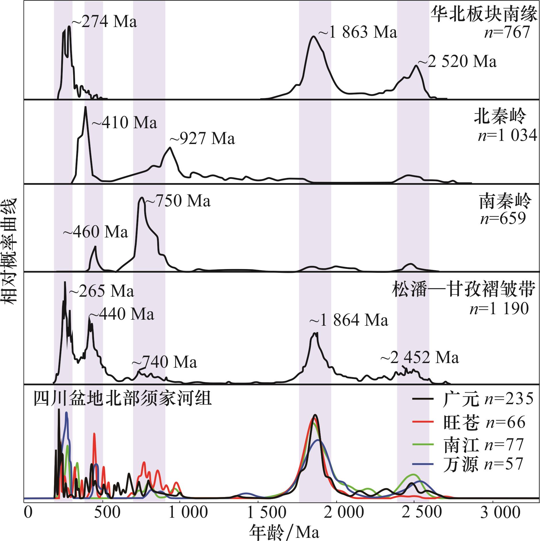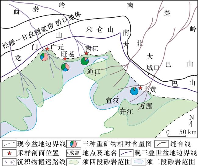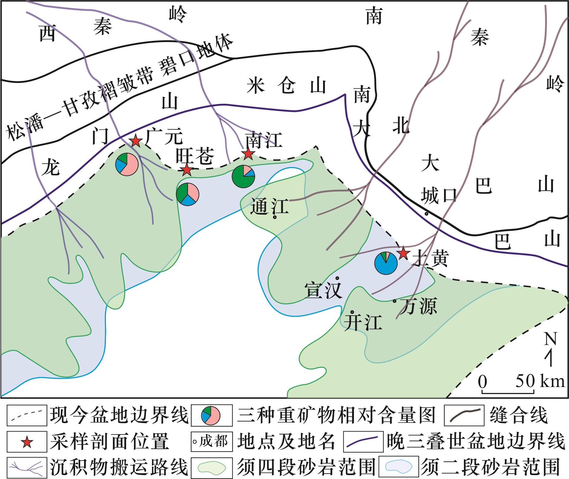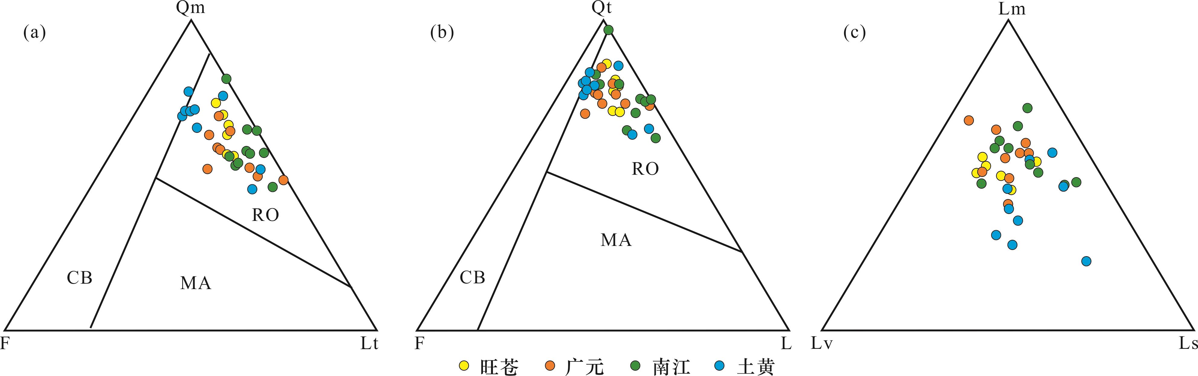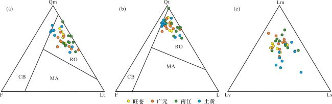 图4 四川盆地北部须家河组砂岩成分三角图(大地构造属性分区据文献[18]) Fig.4 Ternary diagrams of sandstone composition for the Xujiahe Formation in northern Sichuan Basin (the zoning of tectonic attributes in the earth is cited from Ref.[18]) |