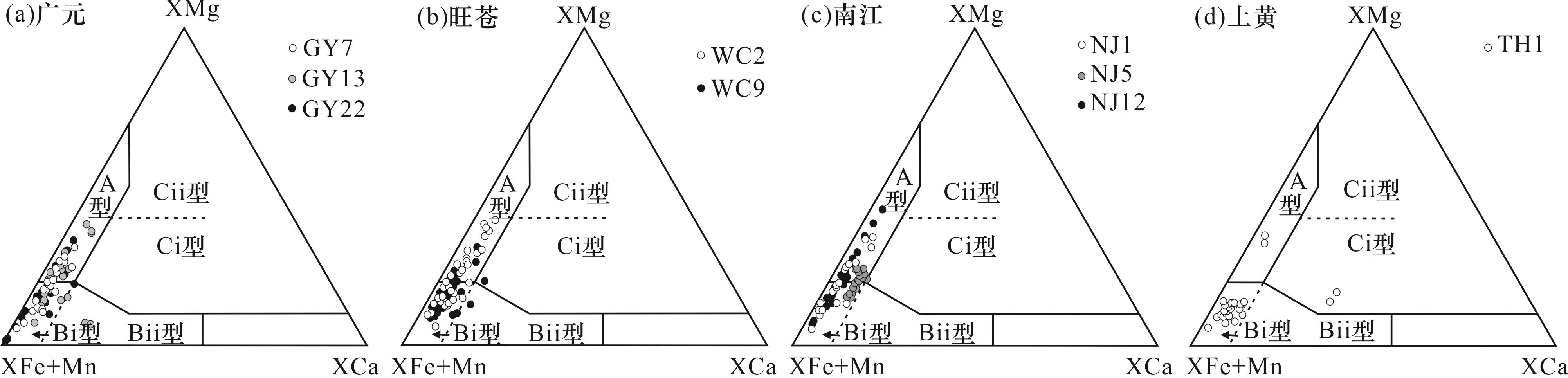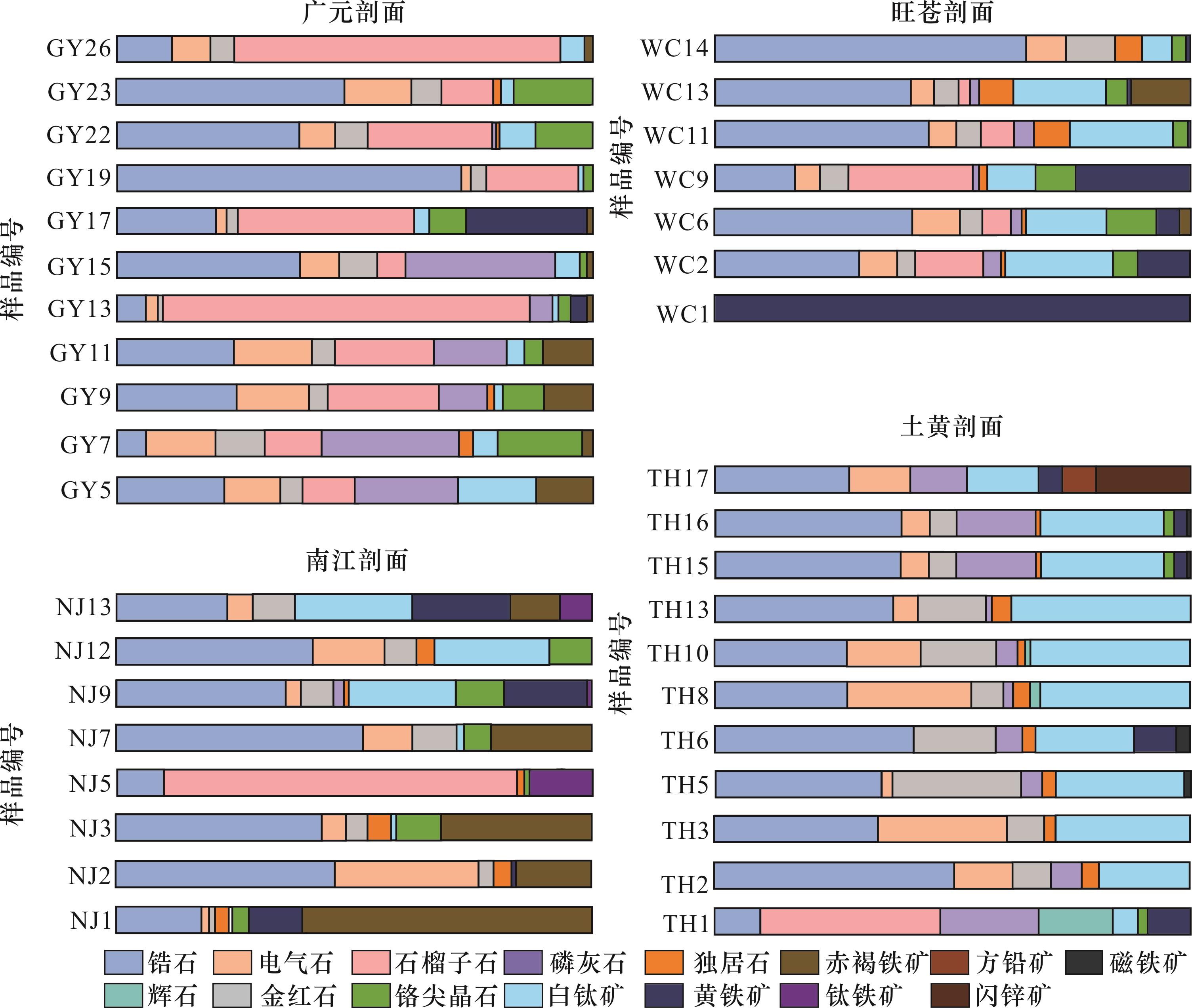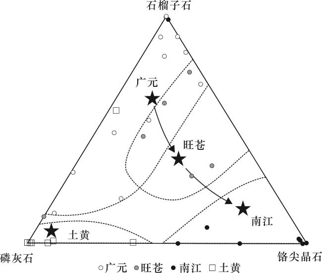 图6 广元、旺苍、南江和土黄剖面所含石榴子石源岩岩性判别图 Fig.6 Garnet source rock discrimination diagram for samples from Guangyuan, Wangcang, Nanjiang and Tuhuang sections |