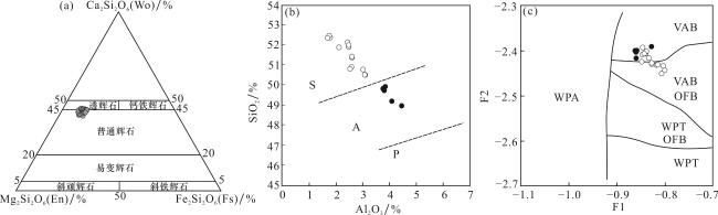 图7 土黄剖面样品TH8所含辉石类型与来源岩浆类型(a)辉石类型判别图版,坐标为三端元成分百分比,底图据文献[26];(b)辉石来源岩浆类型判别图版,底图据文献[24];(c)辉石来源岩浆的大地构造环境判别图版,底图据文献[25]。注:F1、F2由氧化物的质量百分比计算得到(其中所有铁的氧化物换算成FeO),F1=-0.012×SiO2-0.080 7×TiO2+0.002 6×Al2O3-0.001 2×FeO-0.002 6×MnO+0.008 7×MgO-0.012 8×CaO-0.041 9×Na2O;F2=-0.046 9×SiO2-0.081 8×TiO2-0.021 2×A12O3-0.004 1×FeO-0.143 5×MnO-0.002 9×MgO+0.008 5×Ca+0.016 0×Na2O。S:Subalkaline,亚碱性;A: Alkaline,碱性;P: Peralkaline:过碱性; WPA: Within Plate Alkalic Basalt, 板内碱性玄武岩;VAB: Valcanic Arc Basalt,火山弧玄武岩;OFB: Ocean-floor Basalt,洋底玄武岩;WPT: Within Plate Tholeiitic Basalt,板内拉斑玄武岩 Fig.7 Pyroxene type and source magma type for sample TH8 from Tuhuang section |