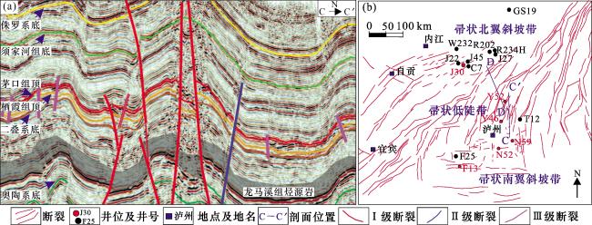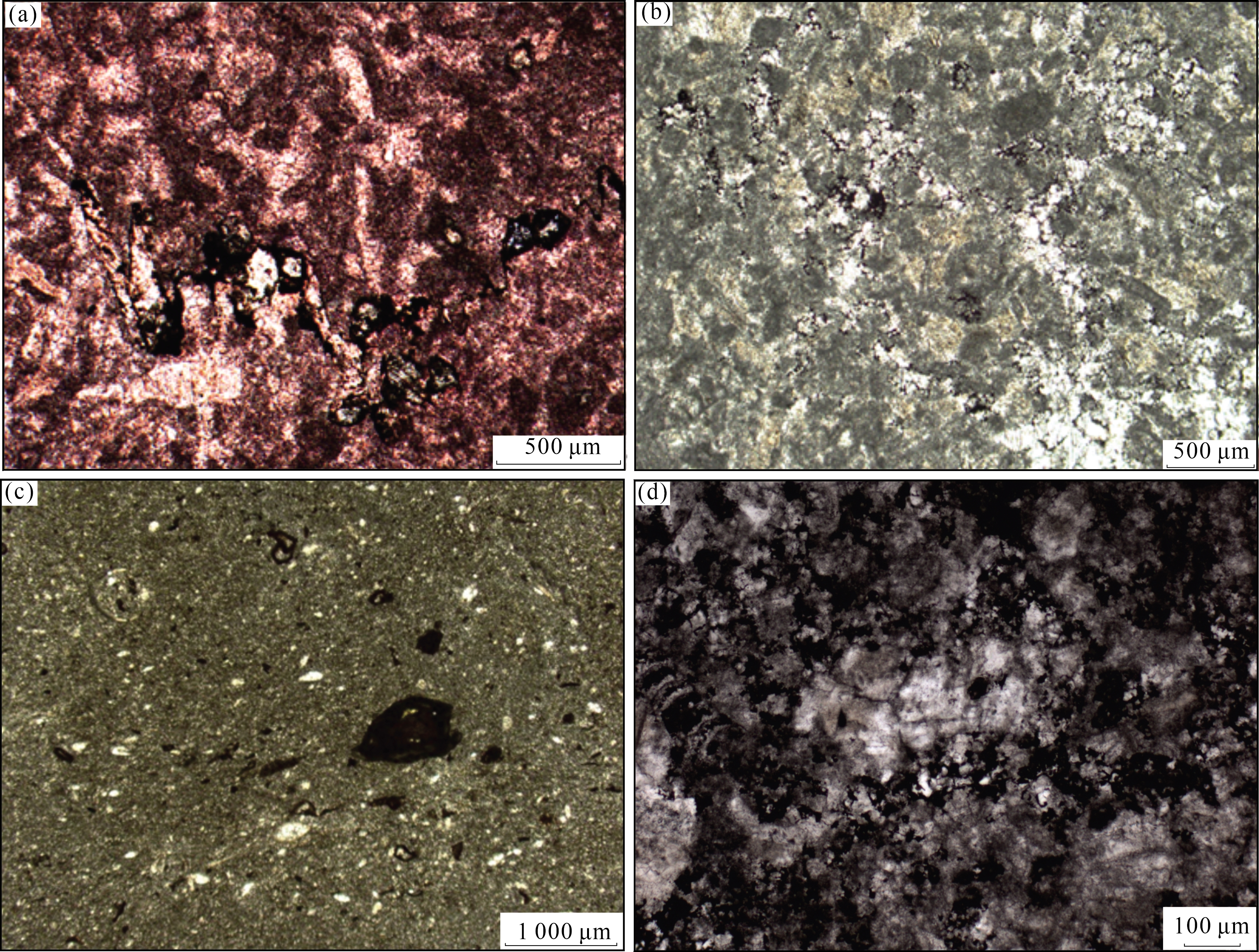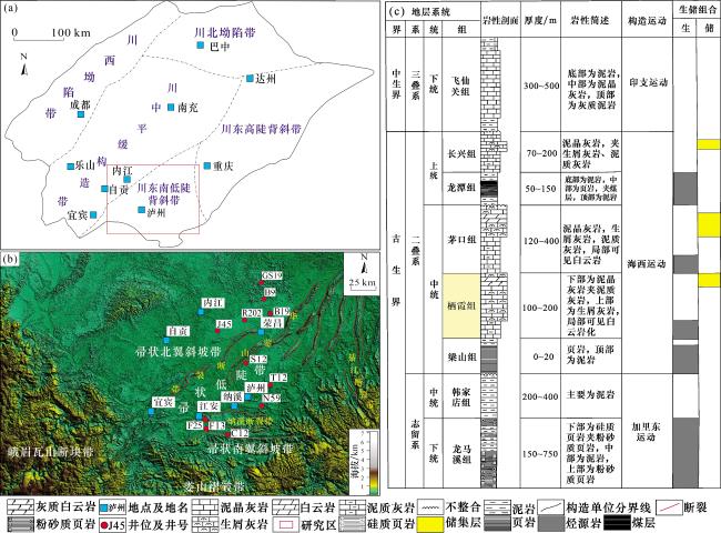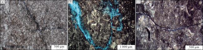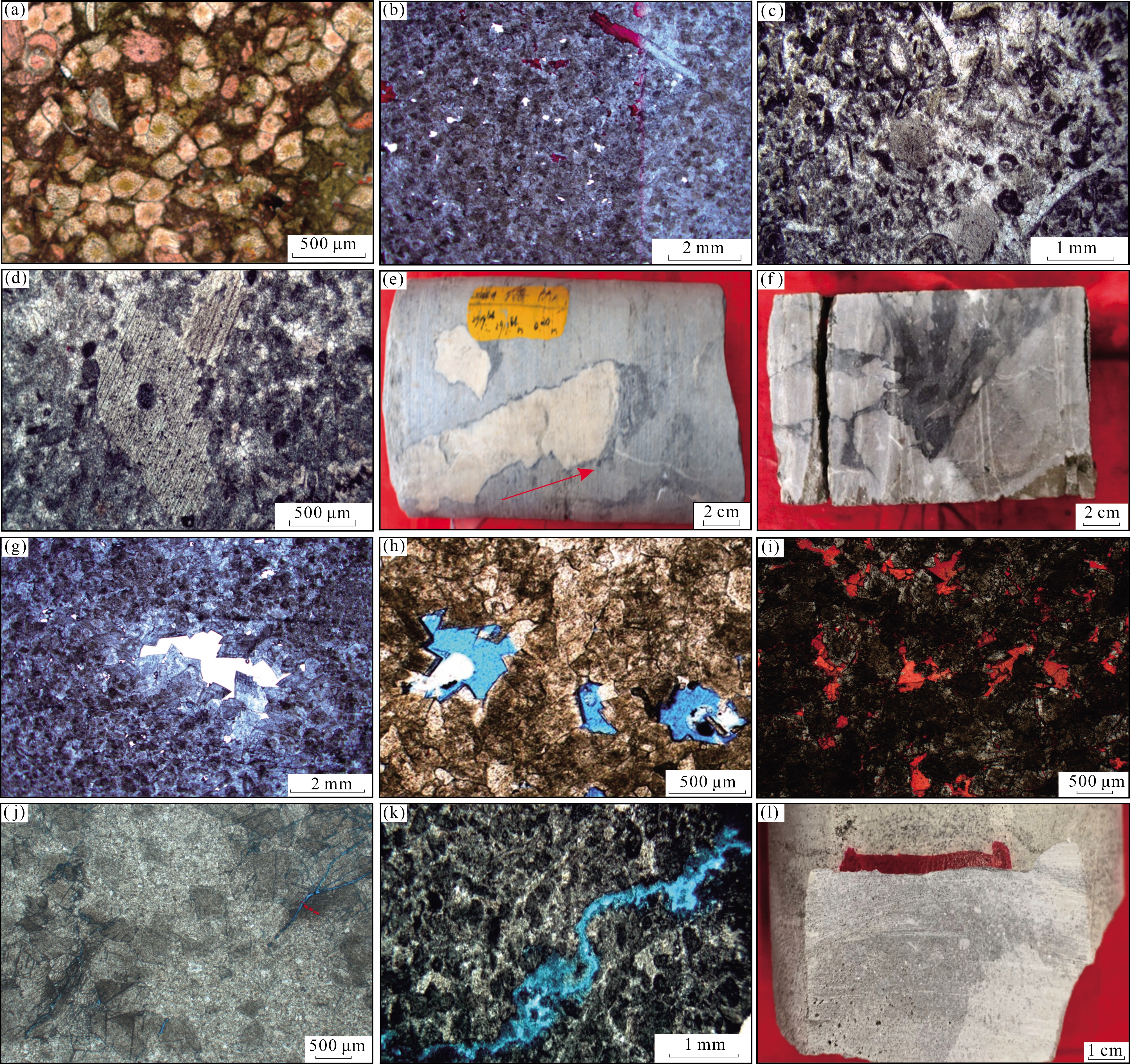 图2 川南地区栖霞组储层岩石学和储集空间特征(a)B9井,P2 q,3 656 m,细晶灰质白云岩,主要由白云石组成,且被少量方解石交代,含少量生物碎屑(瓣腮、有孔虫),(—);(b)J45井,P2 q 2,2 899 m,细晶白云岩,白云石多呈半自形—自形粒状,部分具有雾心亮边结构,晶间被少量方解石充填,见少量生屑,(—);(c)J45井,P2 q 2,2 931.7 m,亮晶颗粒灰岩,颗粒以砂屑为主,部分生物碎屑(棘皮类、瓣鳃类),胶结物多呈亮晶粒状,(—);(d)J45井,P2 q 2,2 915.1 m,白云质亮晶颗粒灰岩,颗粒以砂屑为主,普遍含藻类黏结结构,含生物碎屑(棘皮类),(—);(e)J45井,P2 q 2,2 919.64~2 919.84 m,颗粒灰岩中发育垂直溶沟,垂直渗流带,小型溶洞,方解石充填;(f)J46井,P2 q 2,3 172.41 m,颗粒灰岩中发育的溶沟被深色碳酸盐与泥质混合充填;(g)J45井,P2 q 2,2 897.5 m,细—中晶白云岩,晶间溶孔发育,(—);(h)YJB剖面,P2 q 2,细晶白云岩,白云石晶间孔及晶间溶孔发育,(—);(i)XYSB剖面,P2 q 2,中晶白云岩,晶间(溶)孔被方解石全充填(染色),(—);(j)YLLX剖面,P2 q 2,中—粗晶白云岩,构造缝发育,(—);(k)J45井,P2 q 2,2 897.8 m,亮晶颗粒灰岩,构造溶蚀缝发育,未充填,(—);(l)J45井,P2 q 2,2 899 m,岩溶作用与云化作用叠加,形成云斑,溶蚀孔洞发育 Fig.2 Reservoir petrology and reservoir space characteristics of Qixia Formation in southern Sichuan |