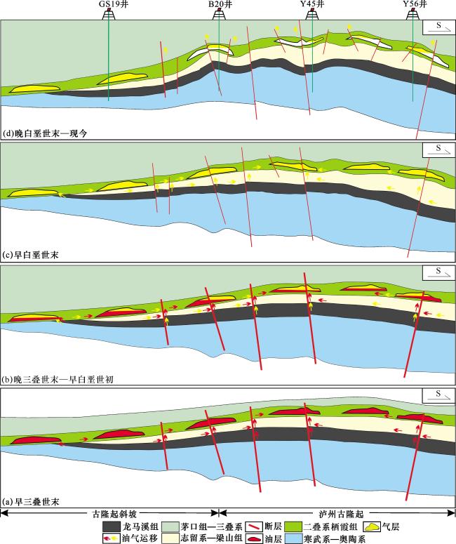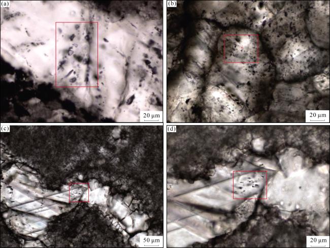 图12 川南地区中二叠统栖霞组储层中流体包裹体显微特征(a) J46井,P2 q 2,3 058.95 m,缝洞充填方解石中含烃盐水包裹体和富沥青包裹体,均一温度为136~139 ℃;(b)J46井,P2 q 2,3 177.73 m,白云石晶粒中含烃盐水包裹体和富沥青包裹体,均一温度为92 ℃;(c)J46井,P2 q 2,3 177.68 m,裂缝充填方解石脉中含烃盐水包裹体和富沥青包裹体,均一温度为132~140 ℃;(d)J46井,P2 q 2,3 177.68 m,放大(c)视域 Fig.12 Microscopic characteristics of fluid inclusions in the Middle Permian Qixia Formation reservoir in southern Sichuan |