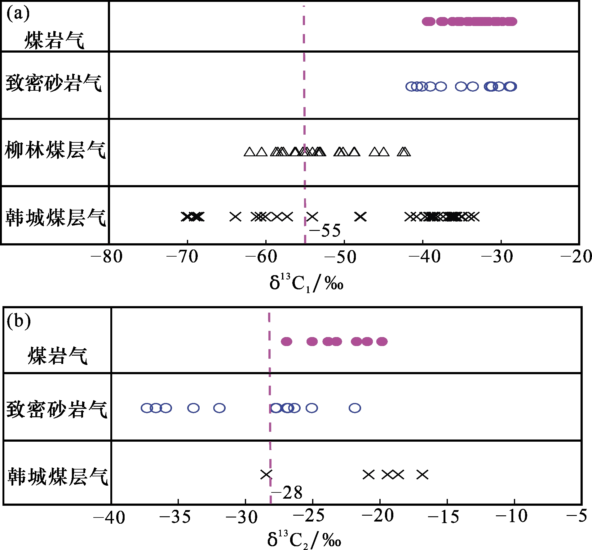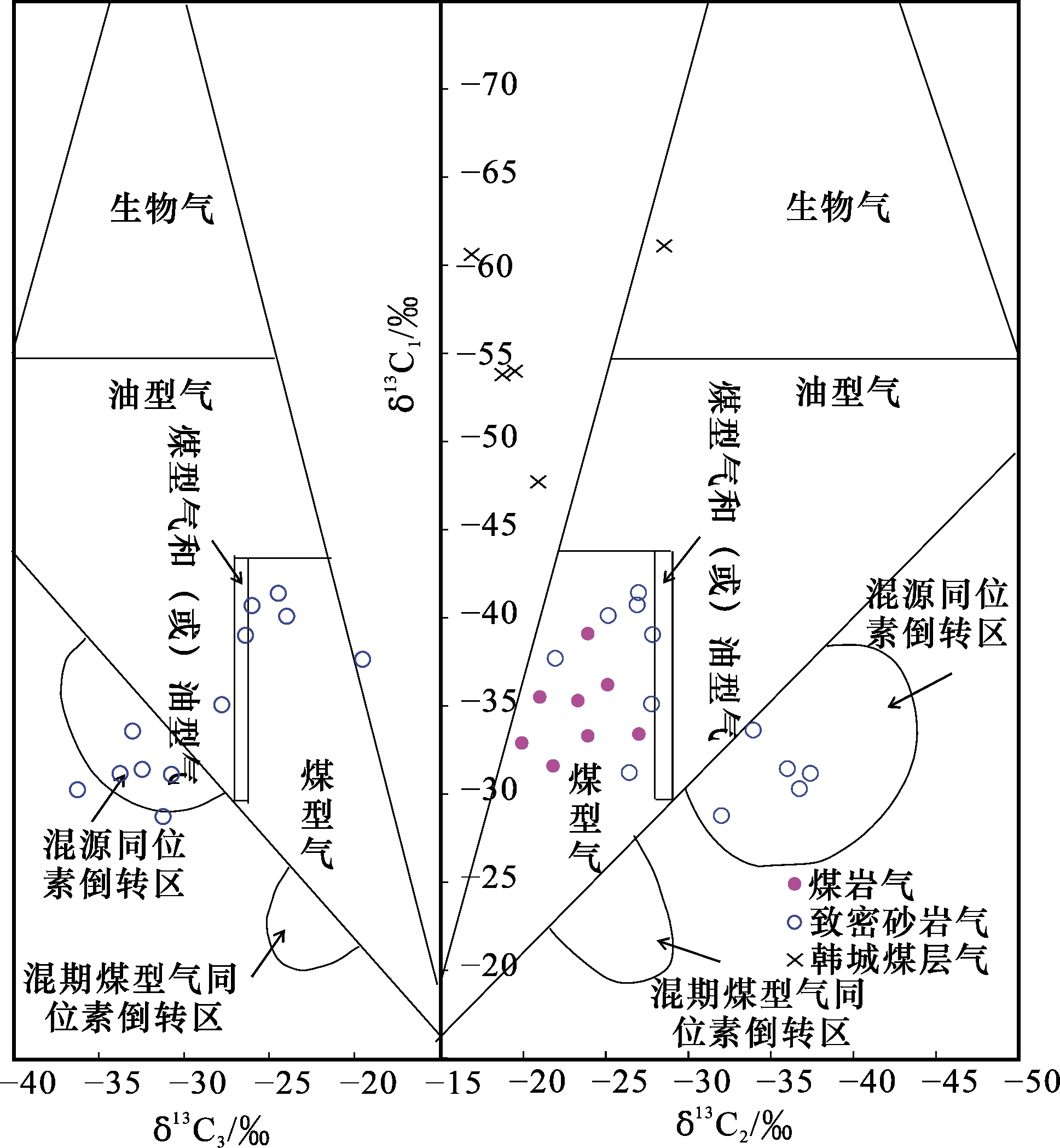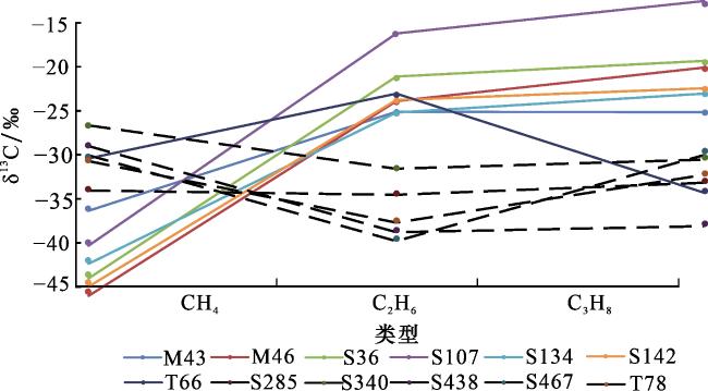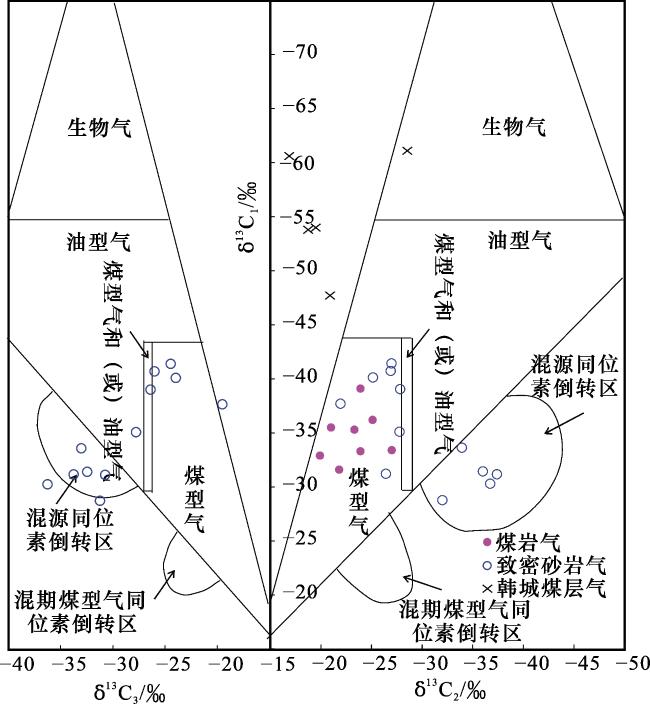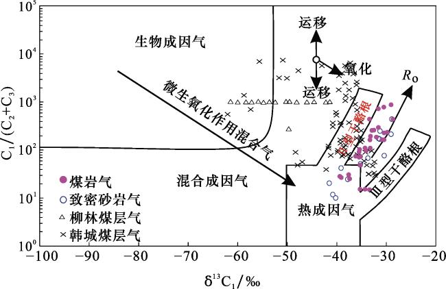 图8),本溪组煤岩气气样都落在煤型气区,表明本溪组煤岩气为煤型气。由于δ
