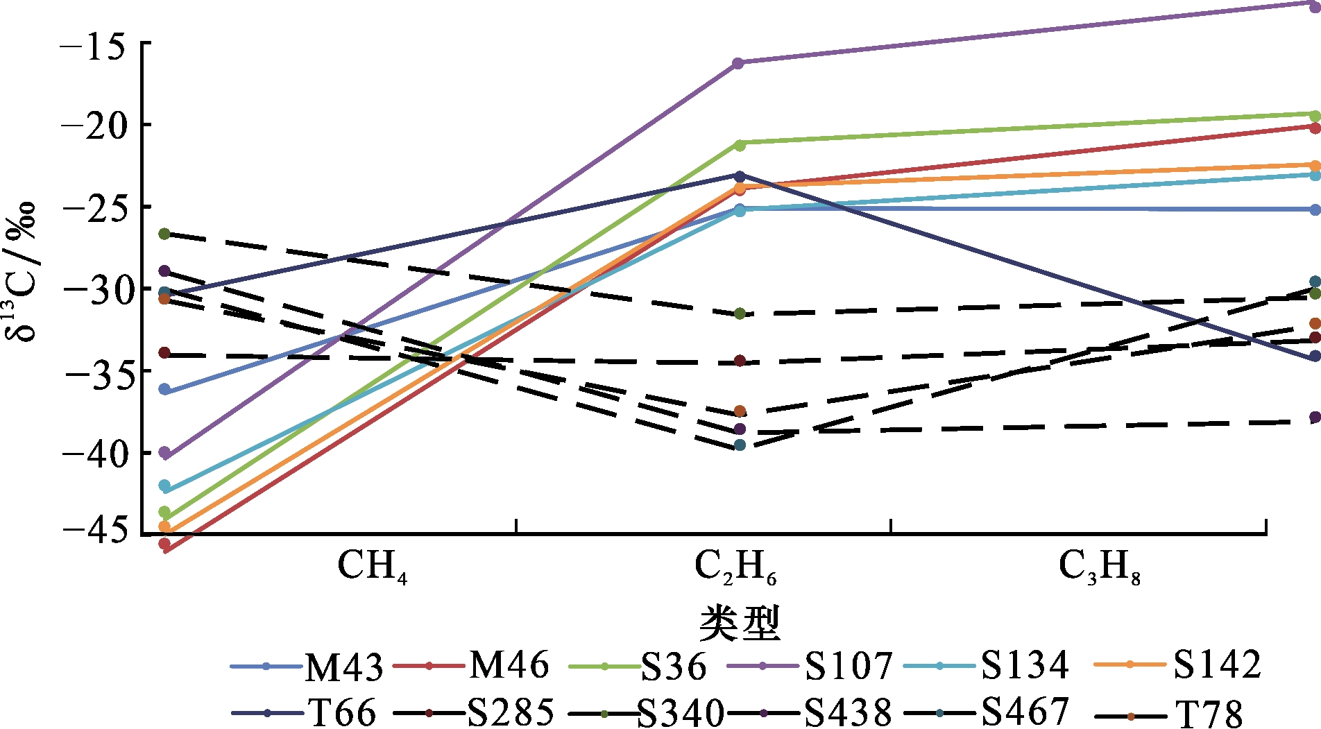 13C值主要分布在-30.1‰~-24.4‰之间,低于煤岩干酪根δ