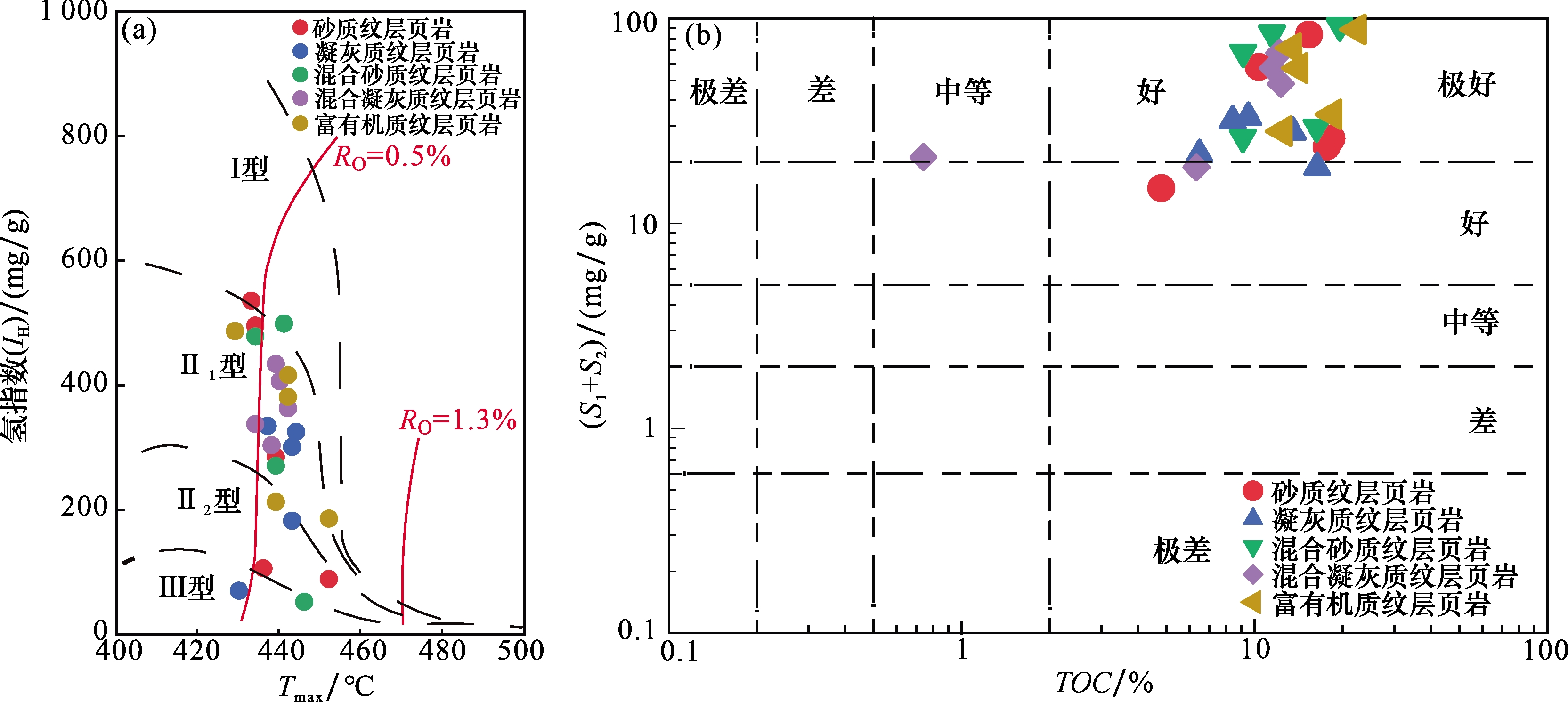 图2(d)];镜下主要呈不连续浅黄褐色,棕红色条带状分布;火山凝灰物质与有机质频繁互层,含断续状和分散状有机质碎片,且以晶屑及沉凝灰质为主;单层厚度主要分布在50~200 μm之间[
