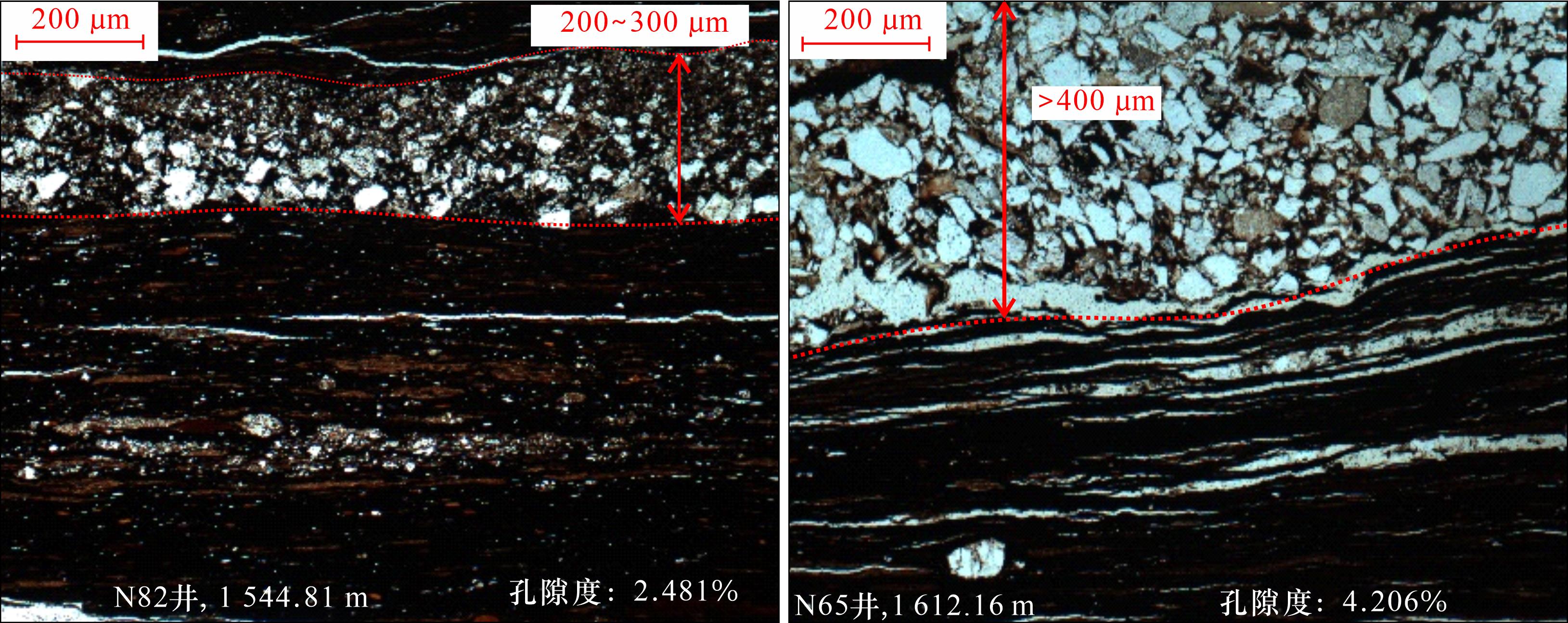 图2(a)];镜下主要呈浅颜色,以石英、长石颗粒为主,表现为粉砂级碎屑结构,颗粒整体上分选中等,磨圆差,颗粒大小分布在10~50 μm之间;压实作用强,颗粒紧密接触;单层厚度多分布在200~1 000 μm之间,单层厚度差异较大[
