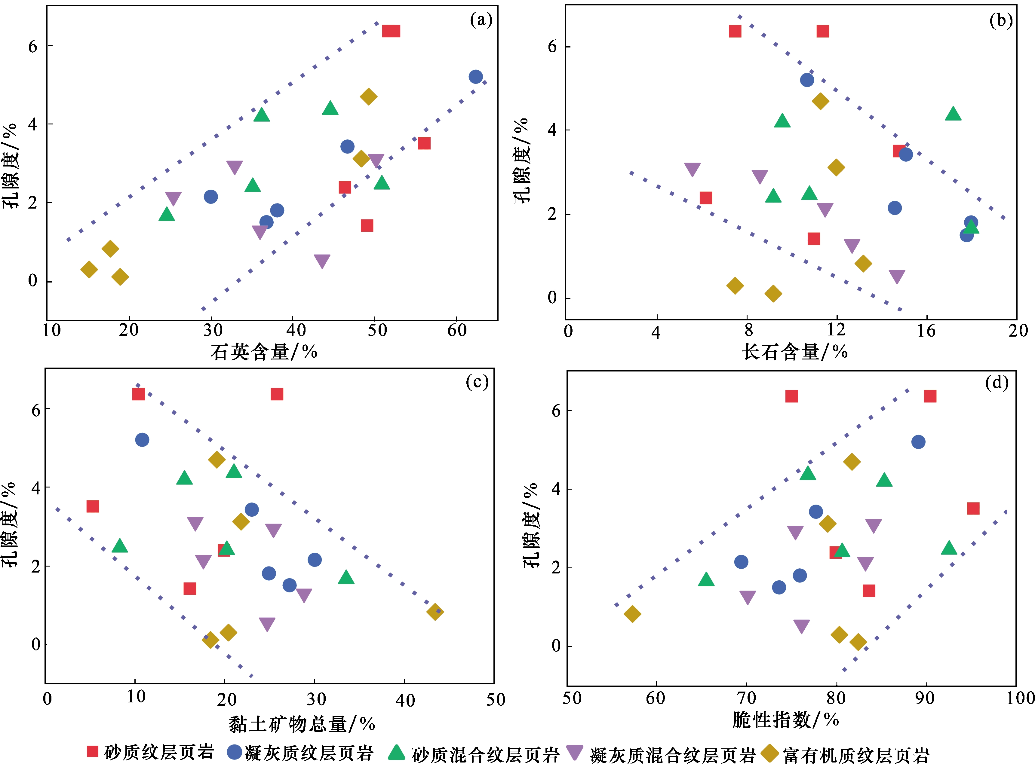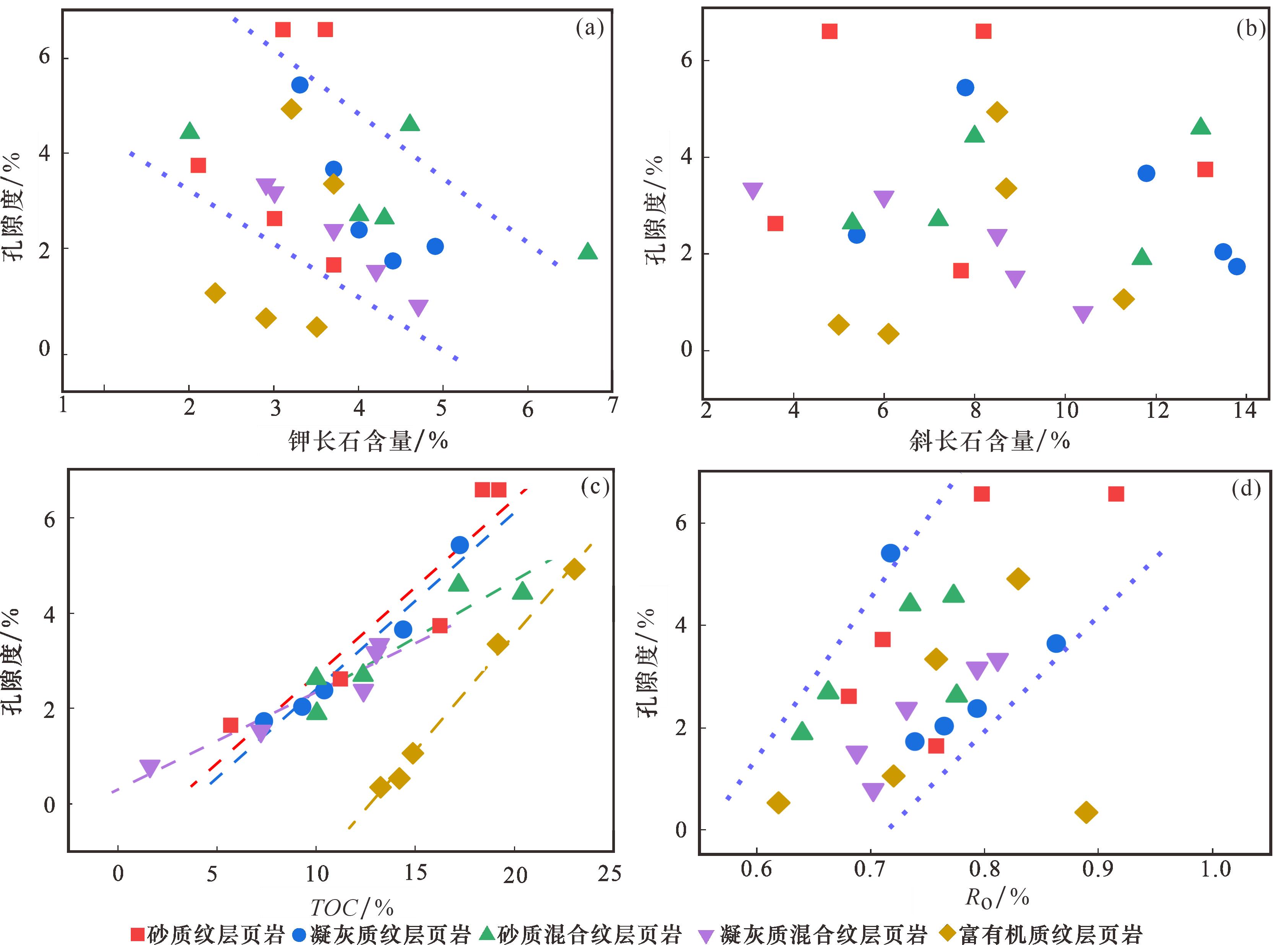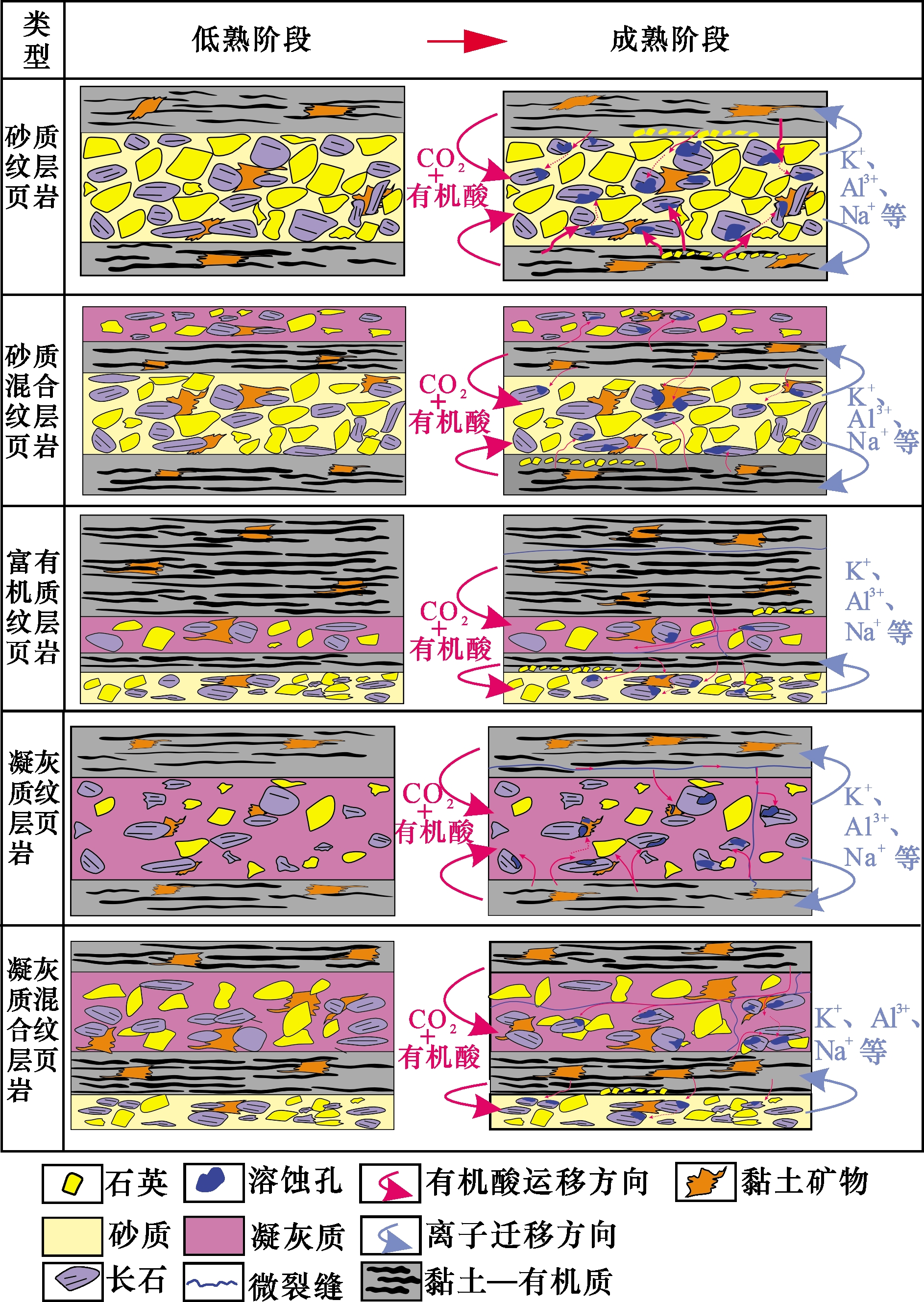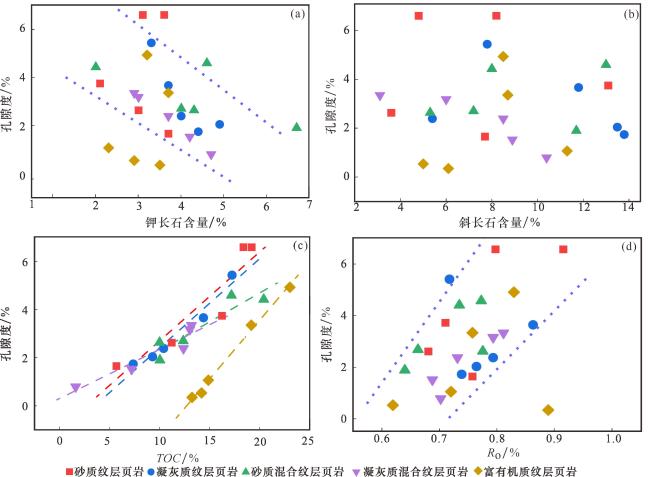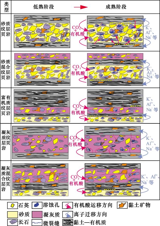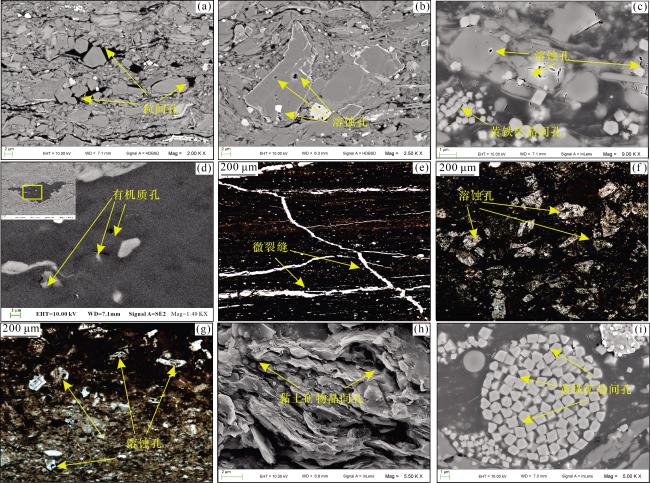 图2(j)];单偏光下主要呈深褐色弱条带状分布,以泥质碎屑结构为主,主要由黏土矿物和少量的极细粉砂组成;常与黑色条带状或断续状有机质伴生,形成“有机—黏土”复合体,层厚较薄,主要分布在30~80 μm之间[