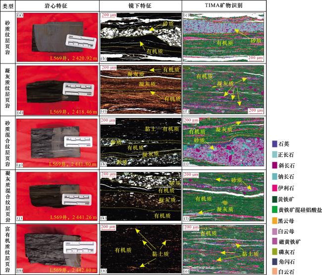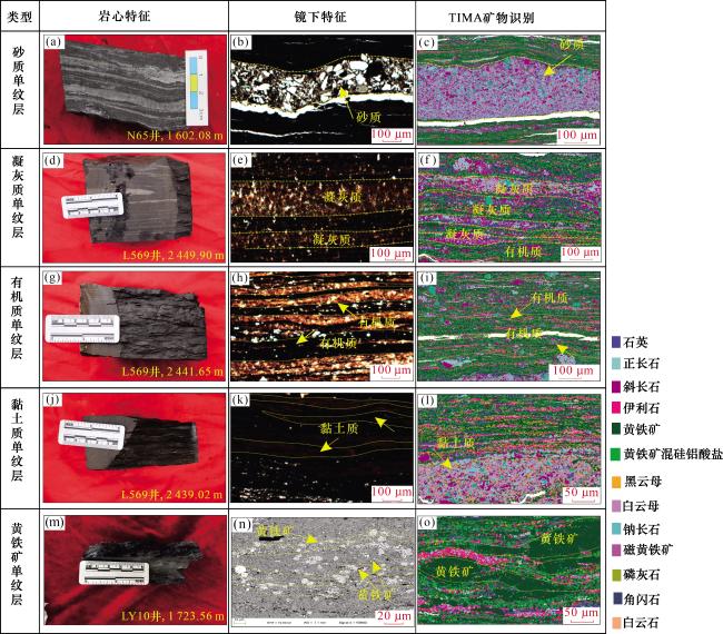 图2(h)];受限于TIMA矿物分析的成像原理无法直接看出有机质单纹层,可以通过单偏光镜下有机质纹层常与黏土或黄铁矿伴生,推断出有机质单纹层的位置[