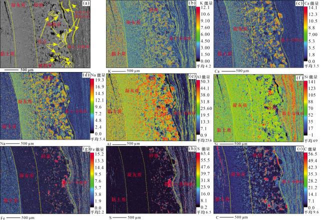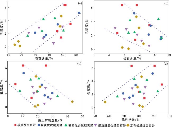 图2(e)];TIMA矿物分析显示:凝灰质单纹层中矿物以长石类矿物为主,少量黏土矿物分布于矿物颗粒之间[
