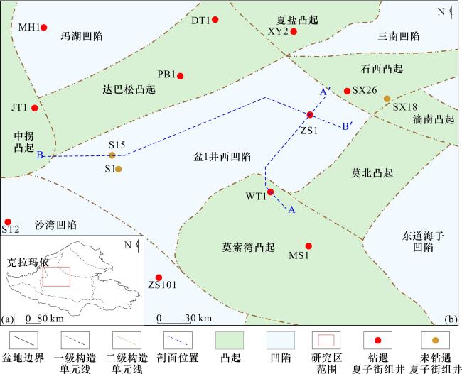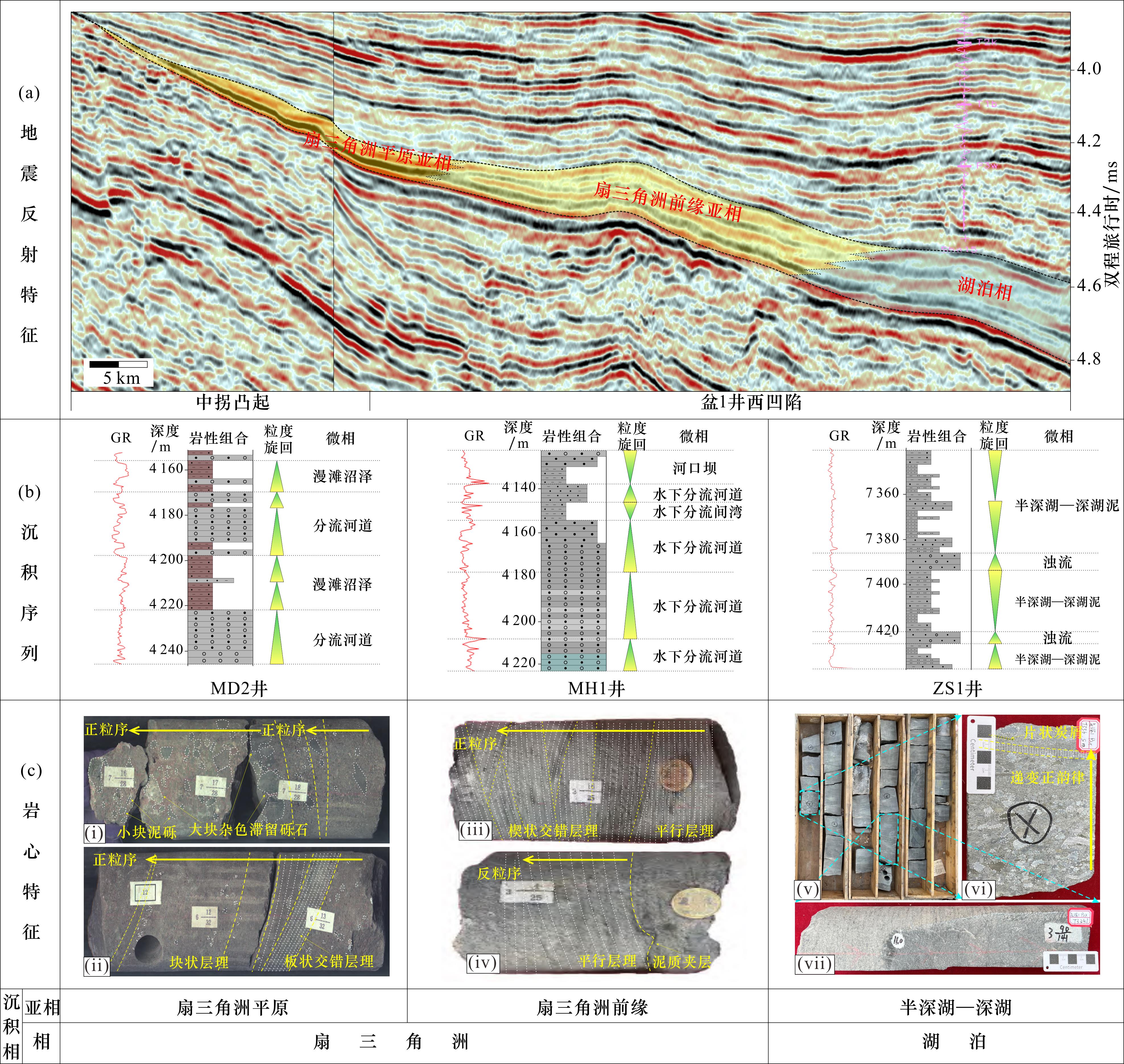 图6 准噶尔盆地盆1井西凹陷夏子街组沉积特征(部分修编自文献[9-10,37])(i)砂砾岩,正粒序,含较多大块杂色滞流砾石和小块泥砾,MD2井,4 273.8 m;(ⅱ)含砾砂岩,正粒序,大型板状交错层理发育,见底部冲刷结构,MD2井,4 248.7 m;(ⅲ)含砾砂岩,正粒序,楔状交错层理发育,MS1井,6 543.8 m;(ⅳ)中—细砂岩,反粒序,粉砂岩段含泥质夹层MS1井,6 542.5 m;(ⅴ)半深湖—深湖泥,含非典型鲍马序列浊流,ZS1井,7 322.6~7 340.6 m;(ⅵ)递变层理砂砾岩,底部见冲刷结构,上部见粉—细砂岩平行纹层与片状炭屑,ZS1井,7 336.5 m;(ⅶ)块状粉砂质泥岩,ZS1井,7 334.1 m Fig.6 Sedimentary characteristics of Xiazijie Formation in Well Pen-1 West Sag, Junggar Basin(modified from Refs.[9-10,37]) |