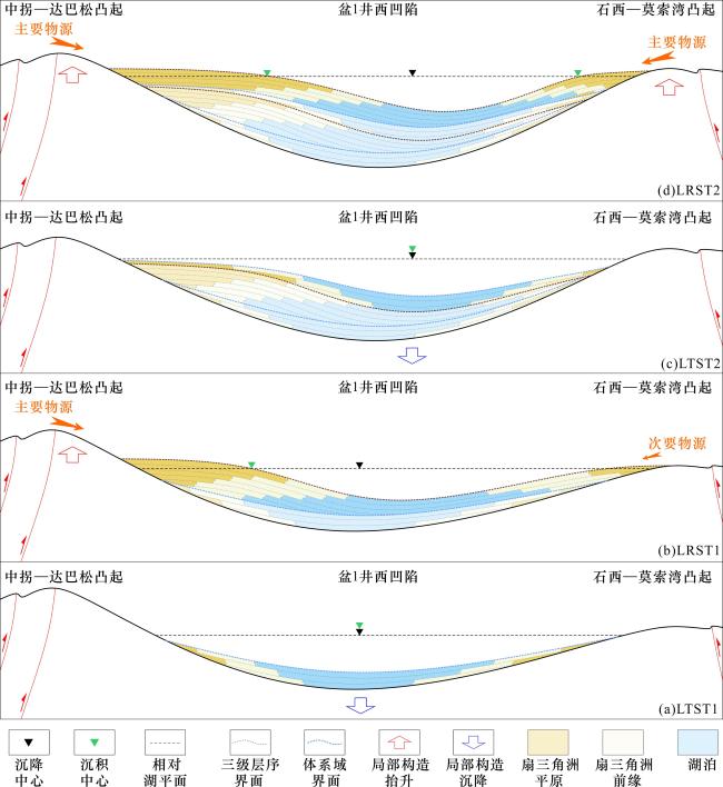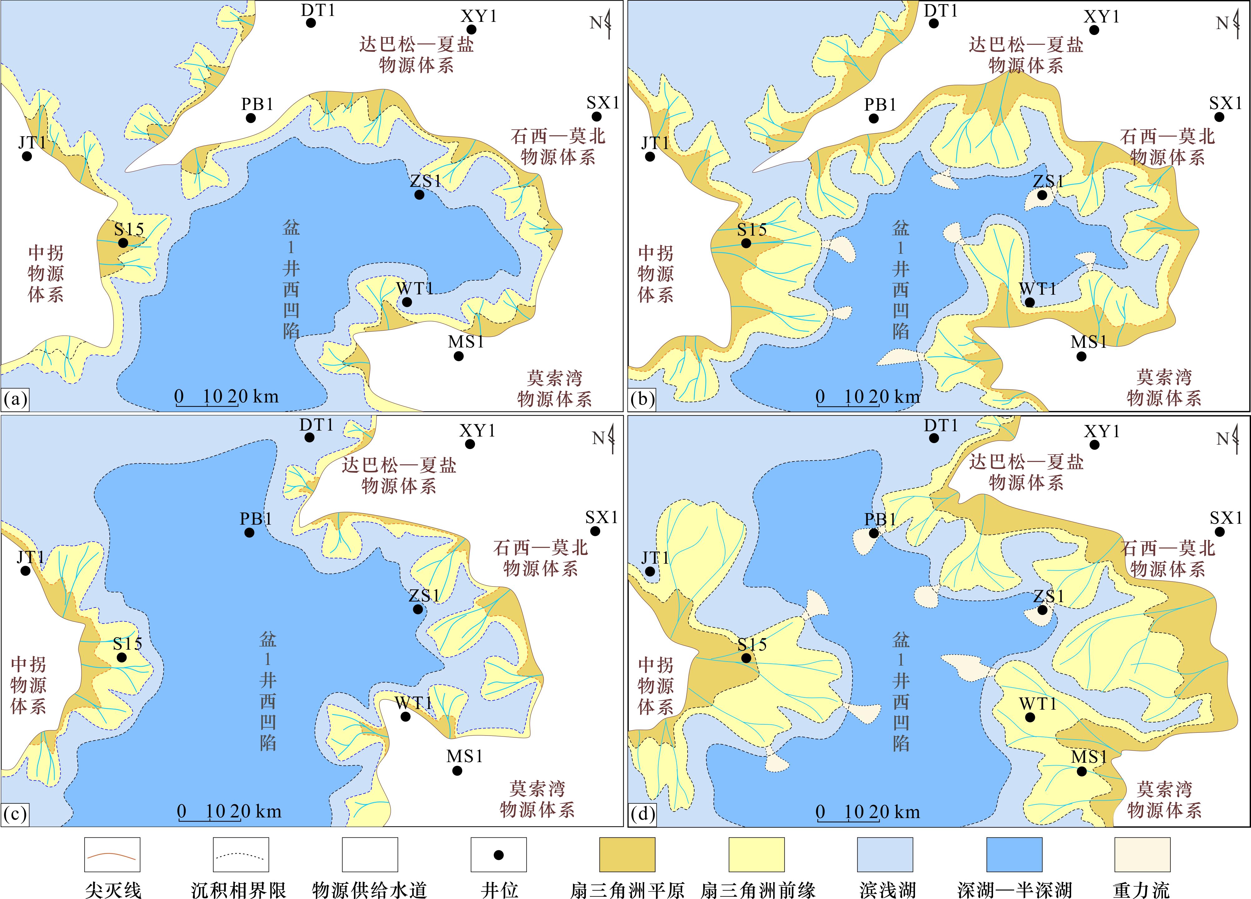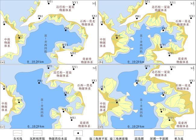 图7 准噶尔盆地盆1井西凹陷夏子街组沉积体系分布(a)夏子街组LTST1沉积体系;(b)夏子街组LRST1沉积体系;(c)夏子街组LTST2沉积体系;(d)夏子街组LRST2沉积体系 Fig.7 Sedimentary system distribution of Xiazijie Formation in Well Pen-1 West Sag, Junggar Basin |