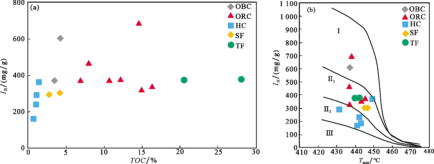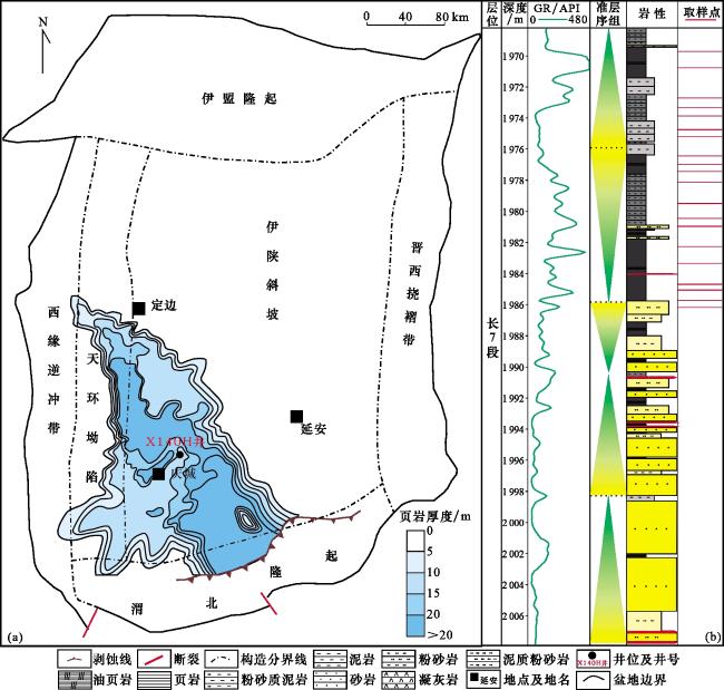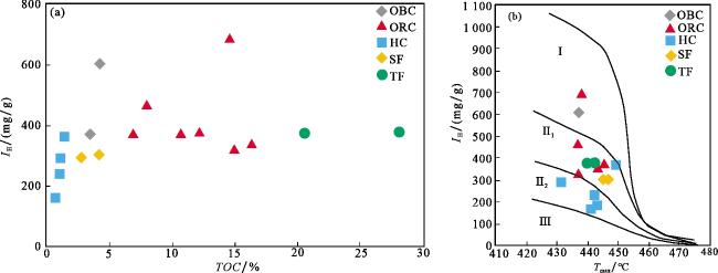 图2 X140H井长73亚段页岩有机地球化学特征(a) TOC—I H交会图;(b) 页岩有机质类型划分图(T max—I H) Fig.2 Organic geochemical characteristics of shale in the Chang 73 sub-member of Well X140H |