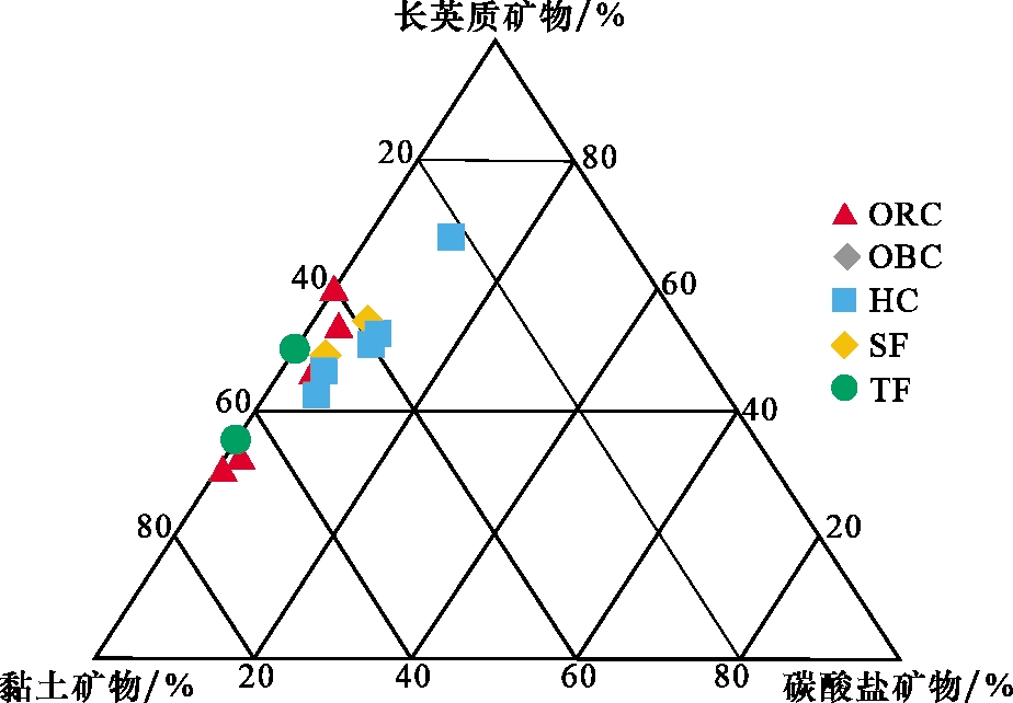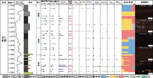 | ORC | 富有机质黏土纹层 | 富有机质板状黏土纹层 | 组成:黏土矿物(65%~80%)、其他碎屑矿物(10%~15%)、有机质(6%~15%) 结构:细粒为主;构造:连续或断续板状、波状、平行 |