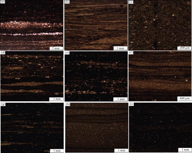 图4 X140H井长73亚段页岩纹层显微照片(a)粉砂级水平长英质纹层,单纹层底部长英质颗粒含量较高,1 982.8 m,单偏光;(b)含有机质波状黏土层,1 977.39 m;(c)均质黏土层(块状),1 970.78 m,单偏光;(d)水平富凝灰质纹层,1 984.75 m,单偏光;(e)水平富凝灰质纹层,1 984.3. m,单偏光;(f)富有机质水平黏土纹层,1 982.08 m,单偏光;(g)富有机质波状黏土纹层,1 984.3 m,单偏光;(h)含有机质水平黏土纹层,1 971.5 m,,单偏光;(i)含有机质均质黏土层,1 973.04 m,单偏光 Fig.4 Micrograph of shale lamina of the Chang 73 sub-member in Well X140H |