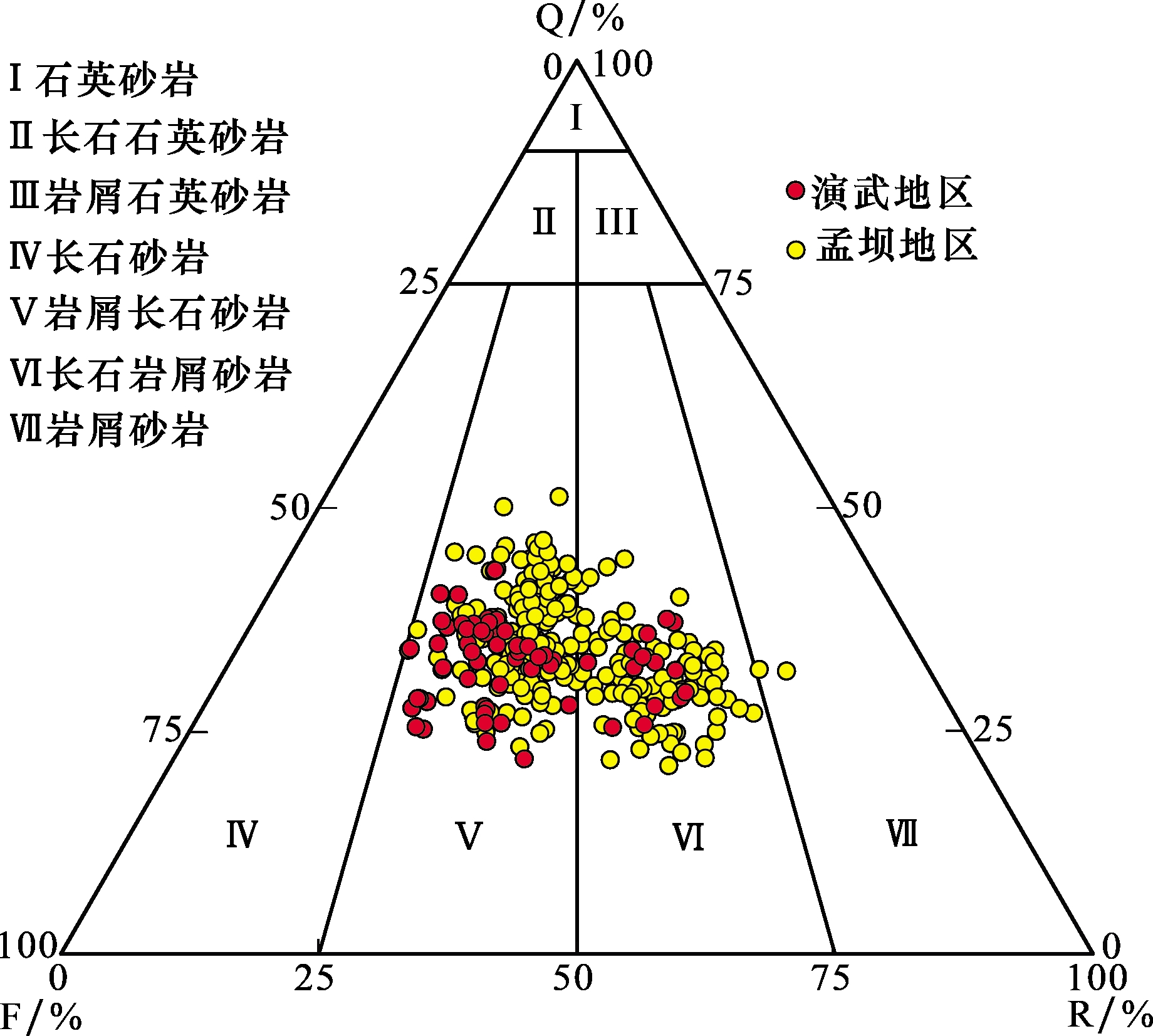 图2 研究区长8段砂岩分类三角图Fig.2 Sandstone classification triangle maps of Chang 8 Member in the study area |