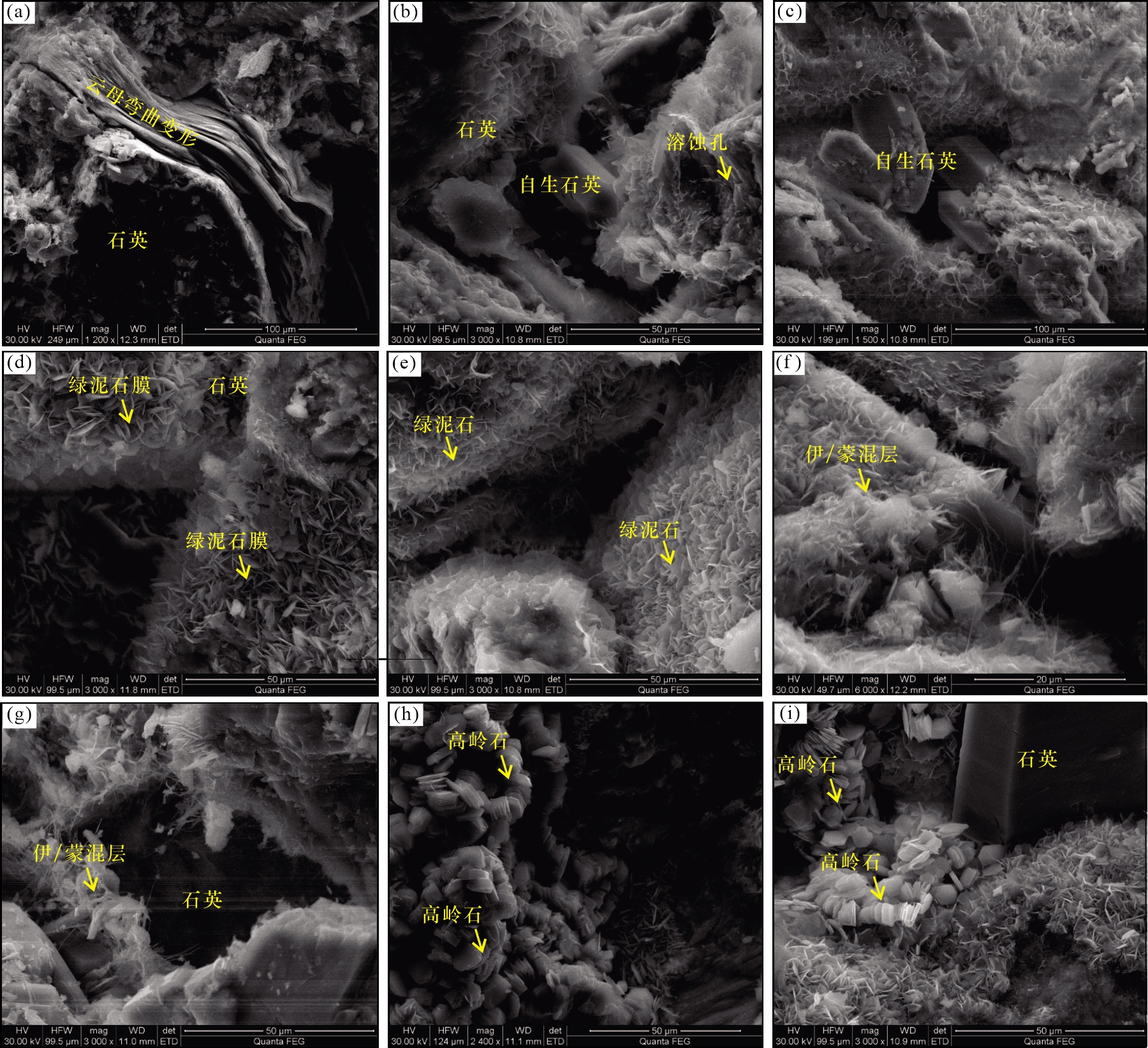 图9 研究区长8段储层成岩作用扫描电镜照片(a)演武地区,M49井,长8段, 2 332.43 m, 云母弯曲变形;(b)孟坝地区,M53井, 长8段, 2 499.15 m, 自生石英充填粒间孔;(c)演武地区,Y98井, 长8段, 2 395.29 m, 自生石英充填粒间孔;(d)演武地区,Y98井, 长8段, 2 357.65 m,绿泥石膜;(e)孟坝地区,M53井, 长8段, 2 499.15 m, 绿泥石膜;(f)演武地区,M49井, 长8段, 2 332.43 m, 伊/蒙混层胶结石英颗粒;(g)孟坝地区, Z82井, 长8段, 2 315.8 m, 伊/蒙混层胶结;(h)演武地区,M88井, 长8段, 2 524.74 m, 蠕虫状高岭石;(i)孟坝地区,M53井, 长8段, 2 499.15 m, 蠕虫状高岭石 Fig.9 Scanning electron microscope photographs of diagenetic of the Chang 8 Member reservoir in the study area |